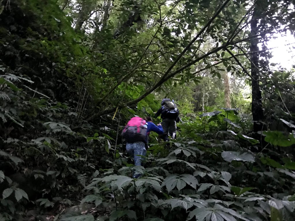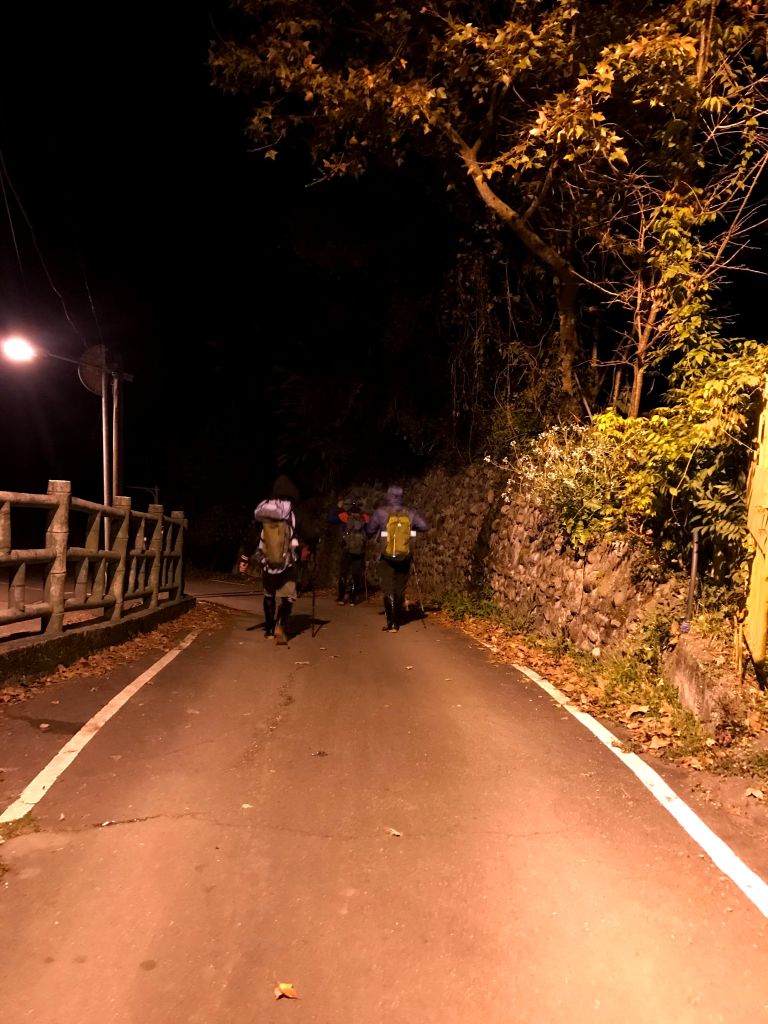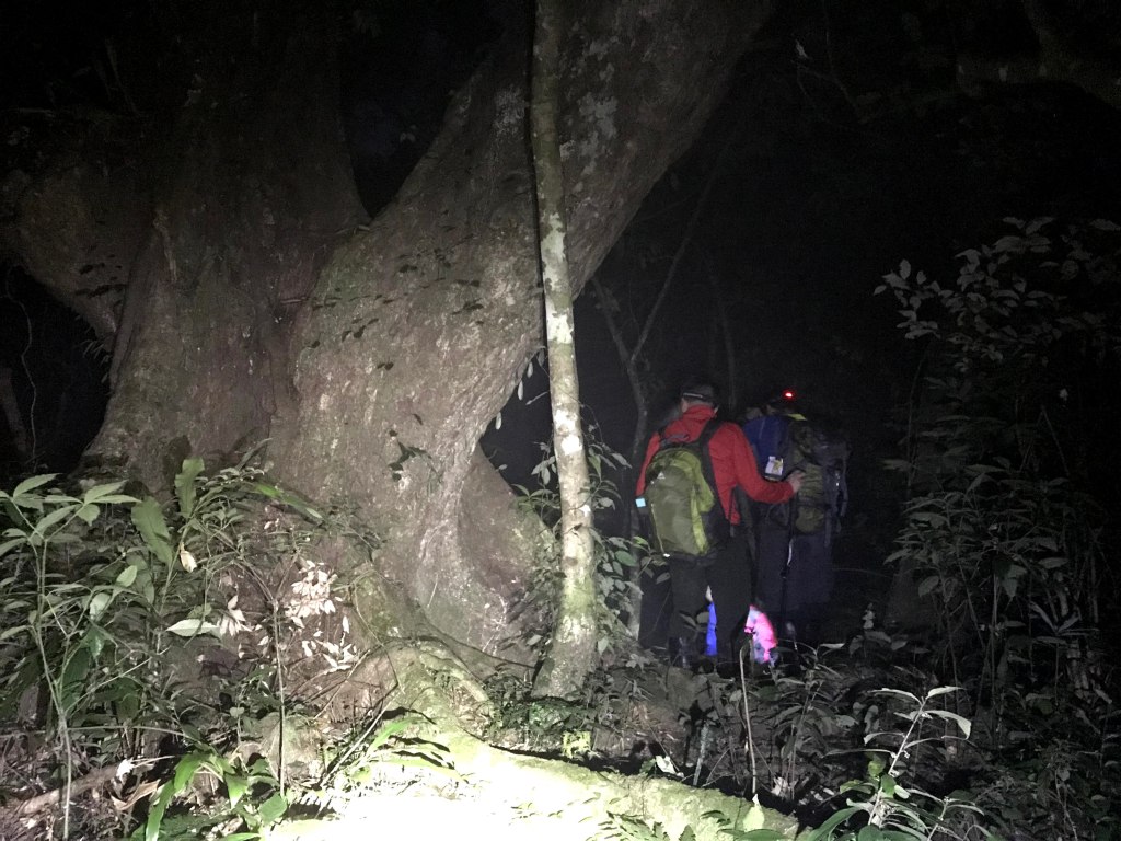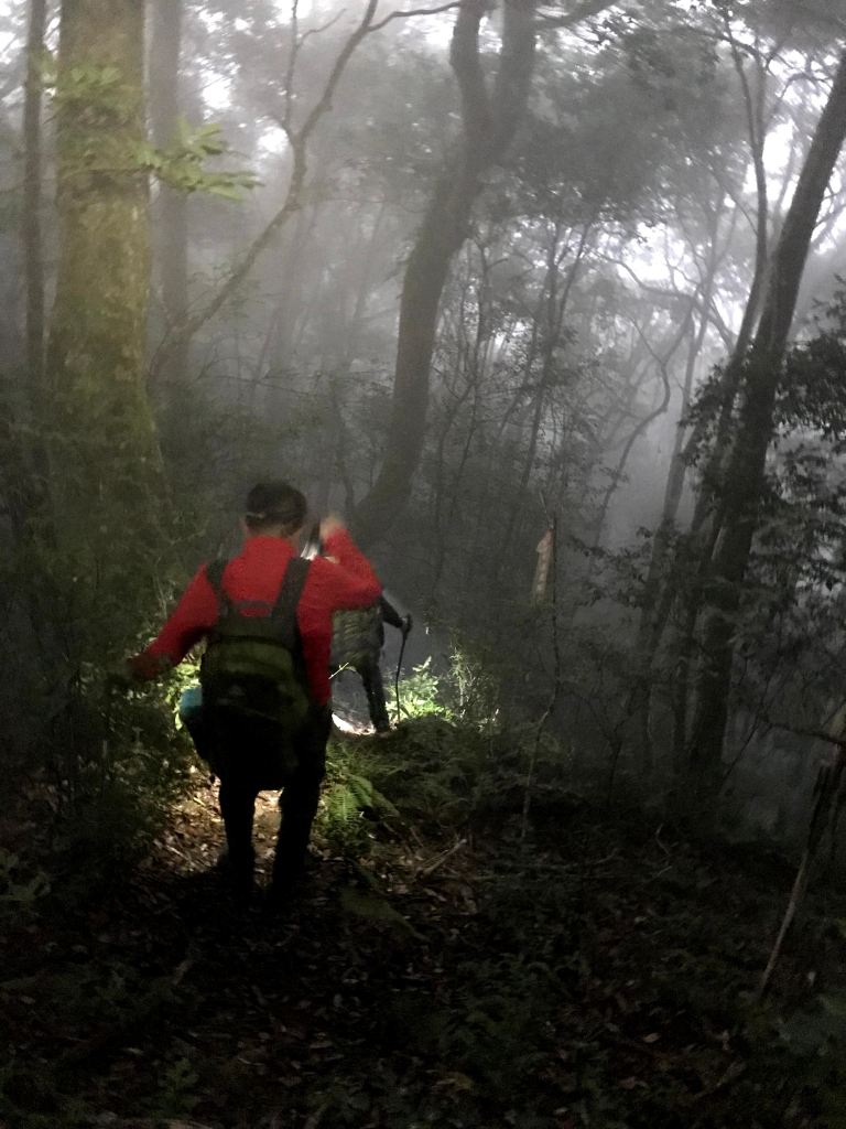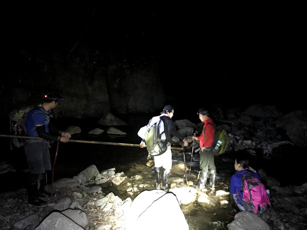 接下來就是逐漸陡下3.5km,要從海拔約1700m下行至海拔800m的三光溪邊,原本預計要走1.5小時,但是,今天天氣多變,大概在17:30時,天色就已經很昏黑了,大夥將頭燈或照明設備戴上,到達溪邊時,已經是18:43。