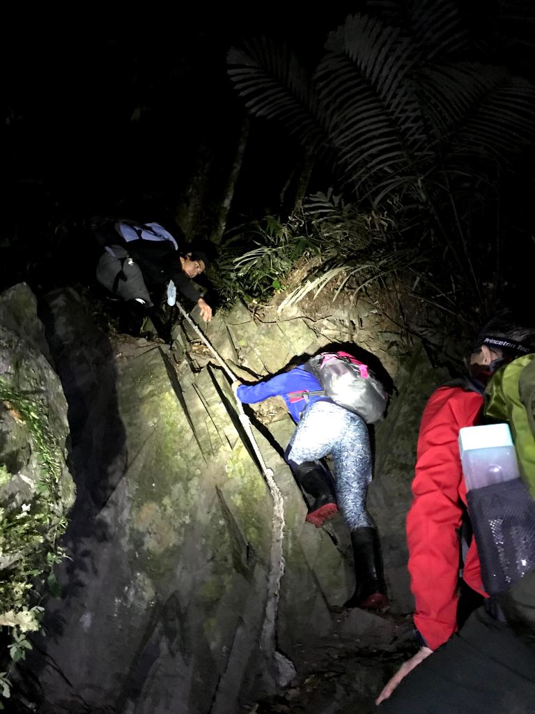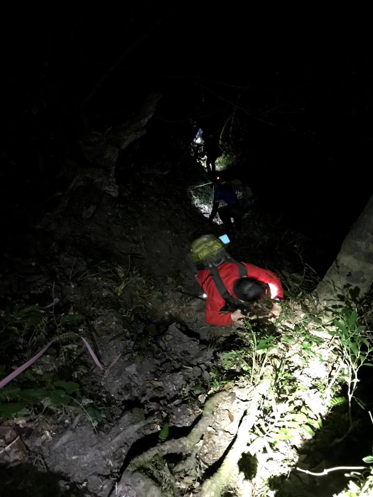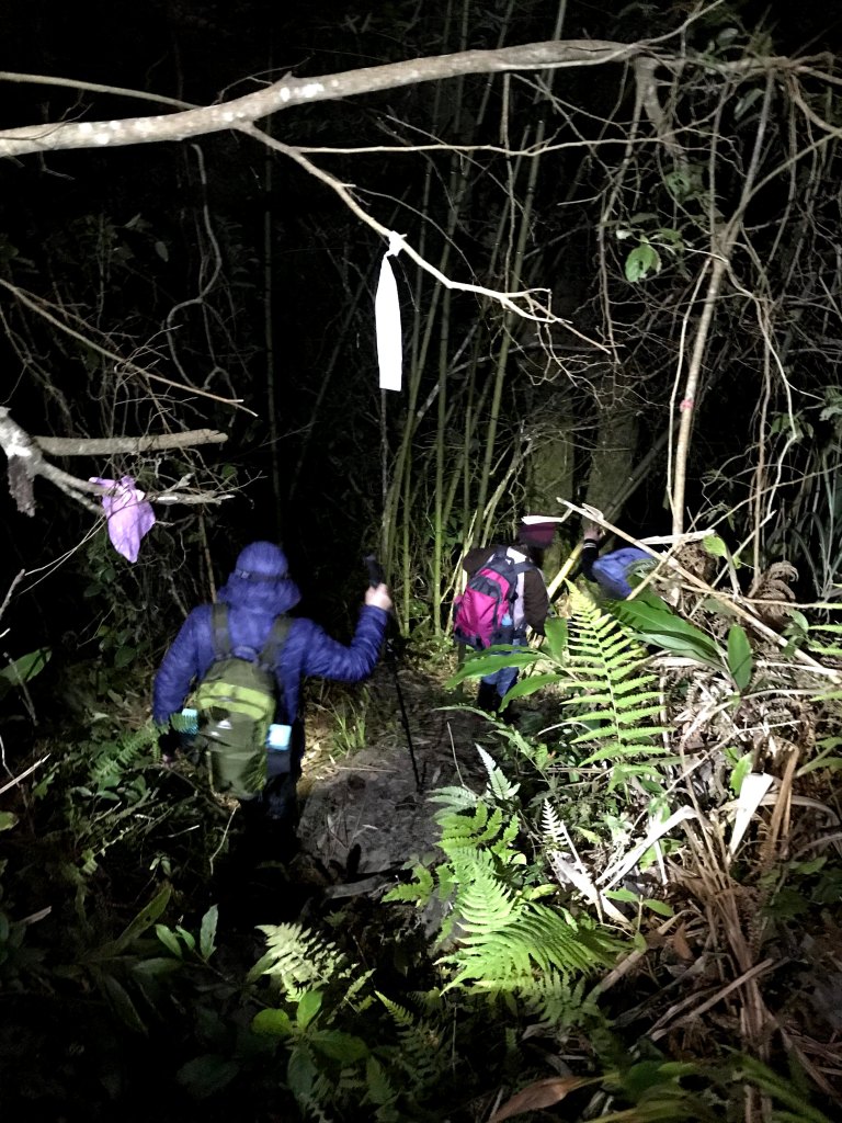 多花了40分鐘,其中因為路滑且兩邊都是稜線斷崖,大夥走得小心翼翼,又兼摸黑,辨識布條方向就變得較為費時,接近溪邊的最後一段200m,山路異常的滑,你會感受到,人下滑、鞋下滑、沙土也跟著在下滑,要很謹慎的一段路!