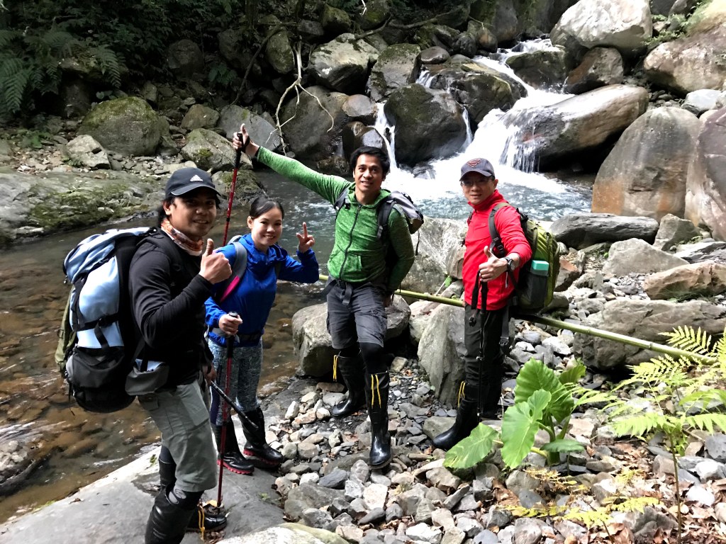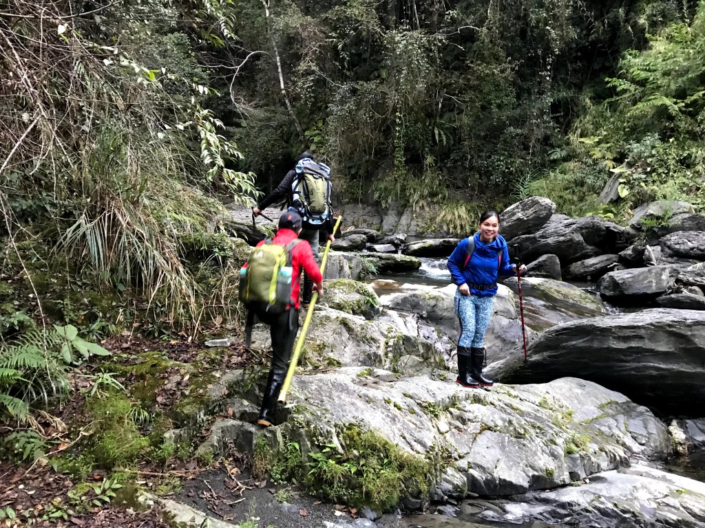 先選好水流較穩定的過溪路徑,利用Elmer先前找來的長竹竿,來幫助大夥過溪,Kim一不小心,將登山杖給落水,馬上就被下沖幾公尺,Elmer立即沿著溪邊,利用手上的長竹竿去打撈登山杖,讓它流速不會太快。