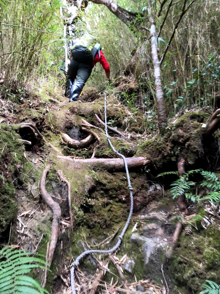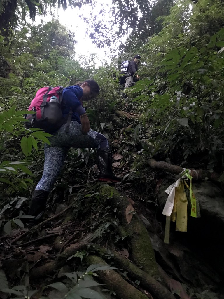 過溪後,即面對一段垂直岩壁攀爬。Kim因為雨鞋不舒服而腳痛,已經有些爬不上去。大夥逐一爬上垂直岩壁,此時,Kim問我「How far?」,我順口開玩笑說「3km more」,突然看到Kim那種好像要關燈的眼神!其實,剩下不到2km,但回到停車場還要爬升約海拔350m。我真不應該在這個時候開這種玩笑。