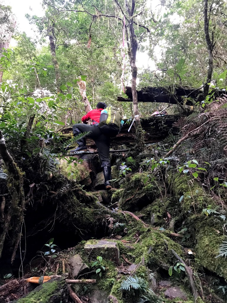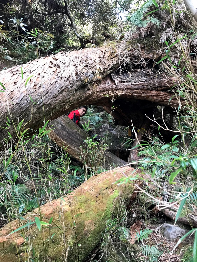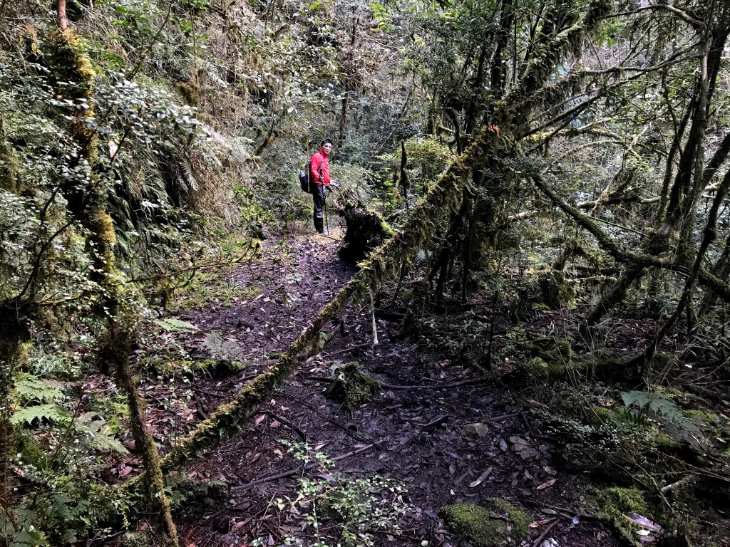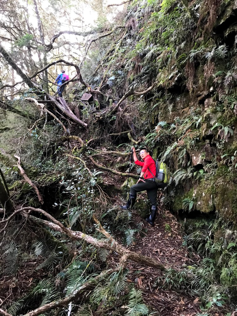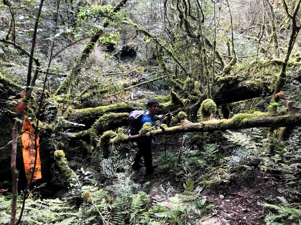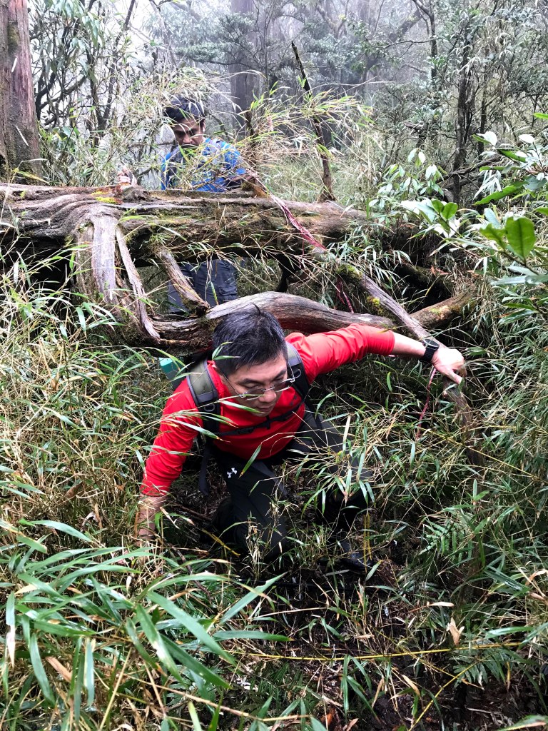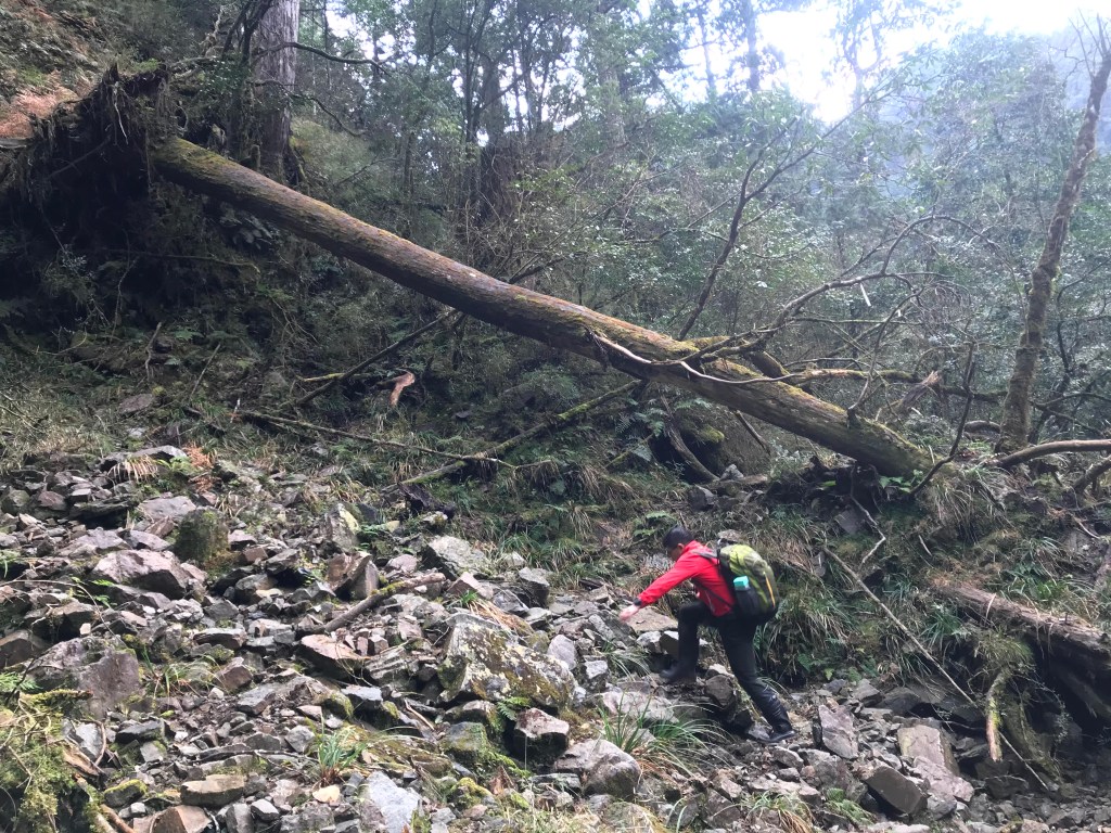繼續前行,接下來的路,倒木很多,路徑也變得比較崎嶇,偶爾必須或攀、或蹲、或跨、或鑽來過各種姿態的倒木。