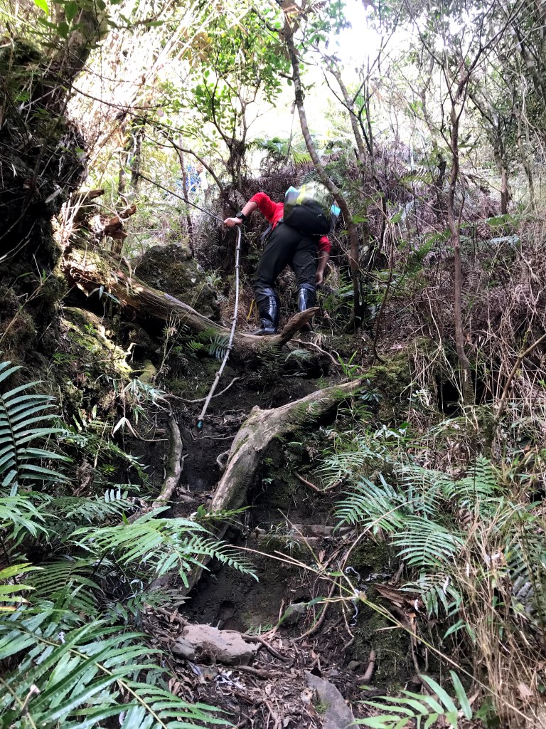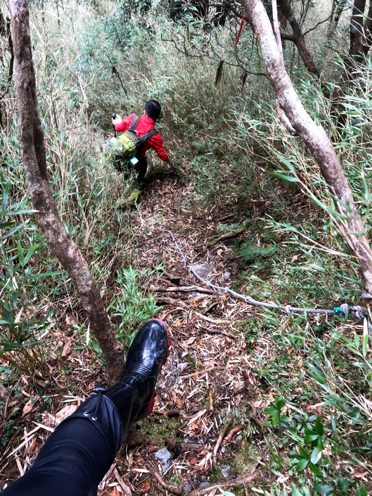 往右下方向下切,此路段要在約300m的距離上,一路陡下海拔200m,經過這段又陡又滑的路徑後,即可接上130號林道。