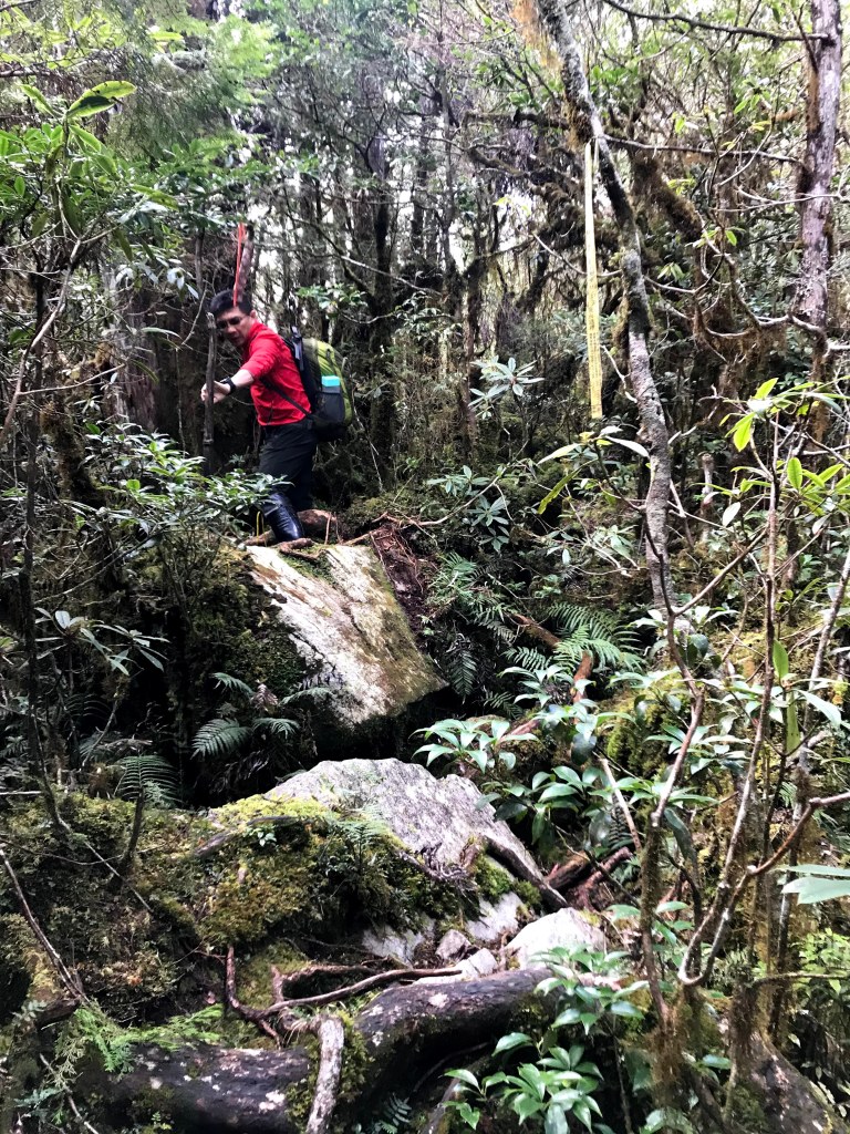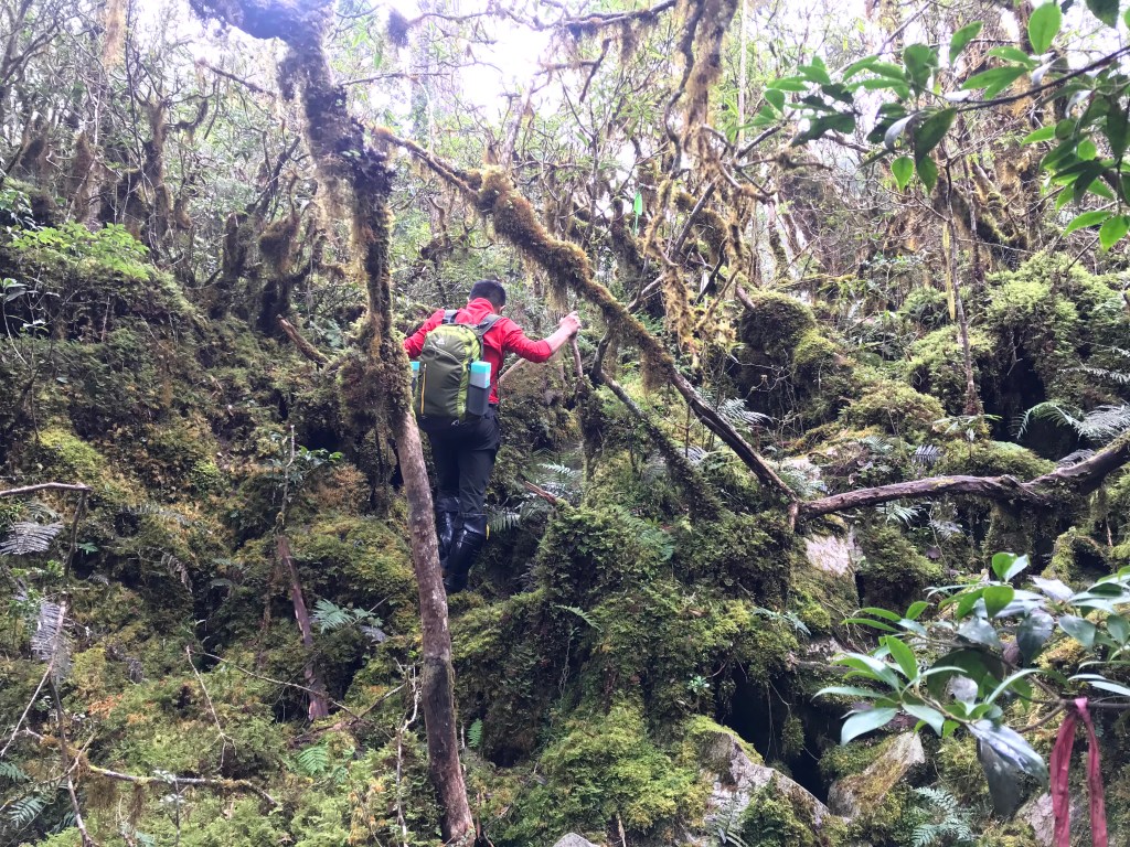 由唐穗山往稜山約要4.6km,看過之前的資料,感覺上,就是路徑很原始且存在上上下下一堆的假山頭,一部份是走在瘦稜上,也就是兩側都是斷崖的稜線上。還好,實際走後發現,瘦稜上的兩側都有樹木等植物,可以稍微消除視線上的恐懼感。不然,就是走在原始林裏,跨越或蹲鑽倒木、箭竹林時有所見。另外,唐穗山往稜山這一段的登山布條,是比較稀鬆的,這是我比較擔心的部分。