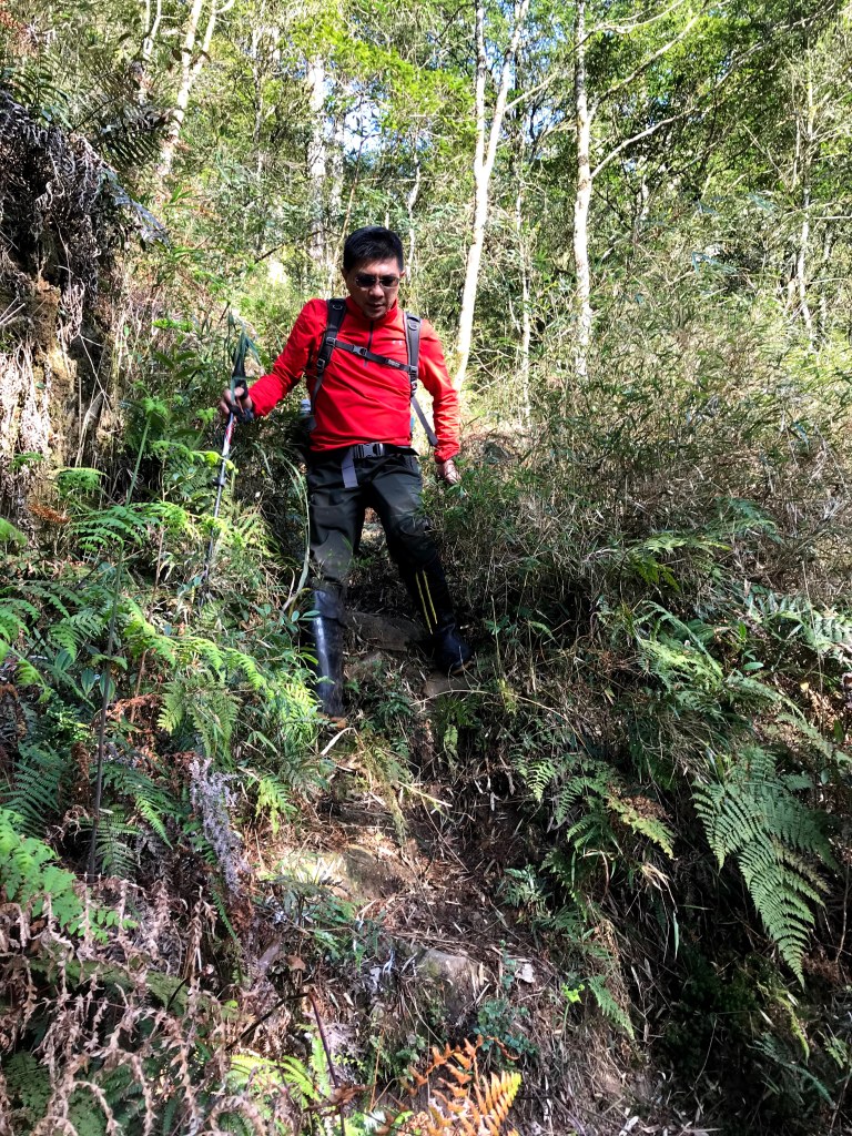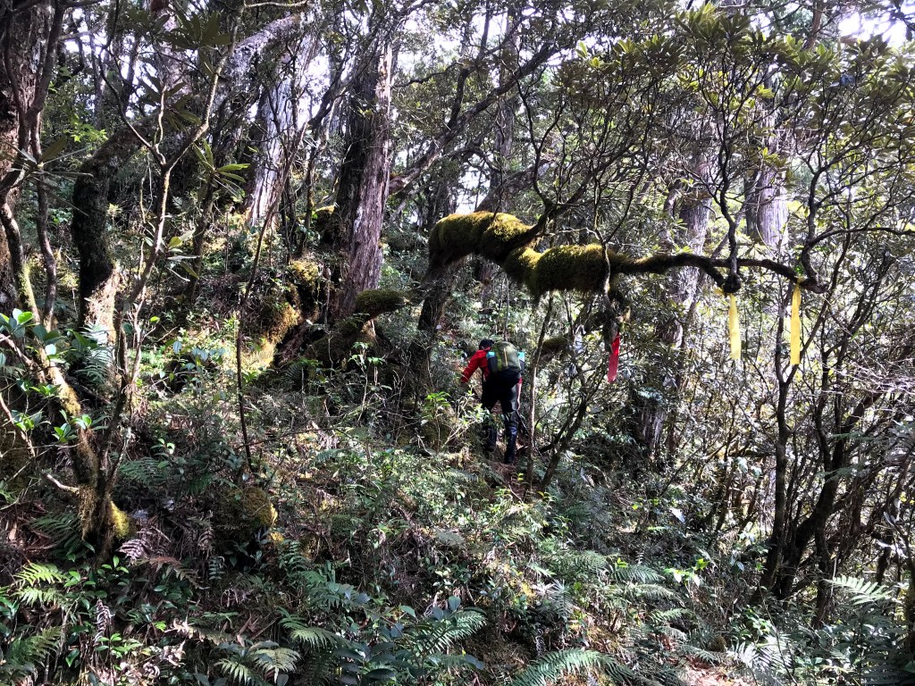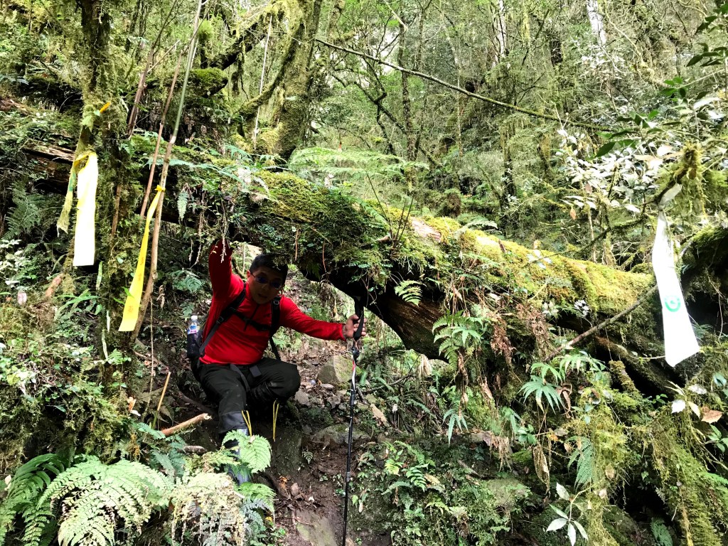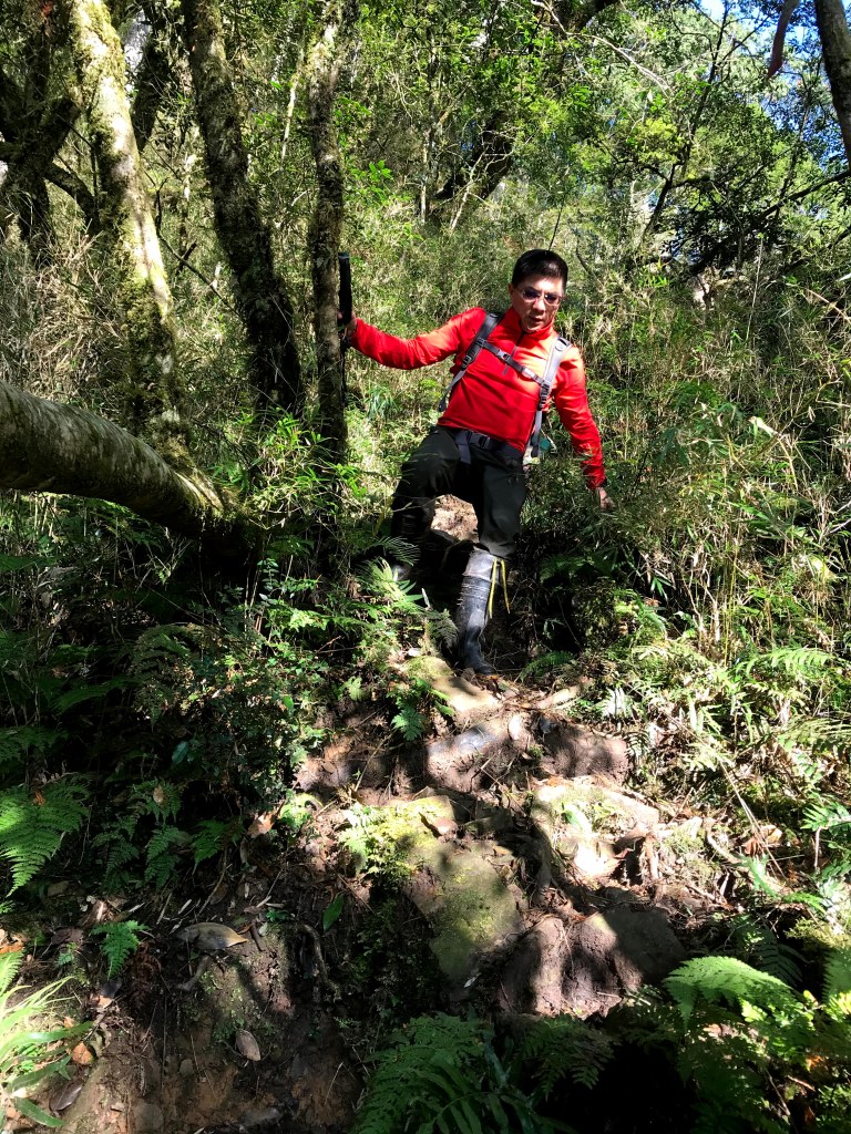 我們的超級Mario,果然不同凡響,在布條有限,且茂密森林路徑不明的條件下,都是一溜煙就不見人影。Smile、Elmer還有我,三人在後面苦苦追趕他們兩人Mario及Kim。但是,偶爾也發現,Mario與Kim會走錯路徑,經過不定時的呼喊來修正,下次會要求每人都帶著哨子或帶著無線電,另外也要不時對著離線地圖。不過,在有岔路時,兩人會先停下來等我們到來確認。結果,原本應該要4小時的路程,只用了2小時55分鐘就到達稜山了。