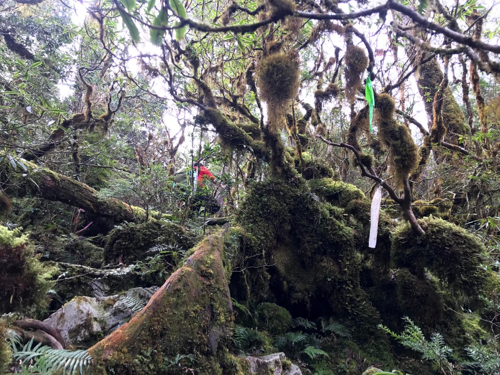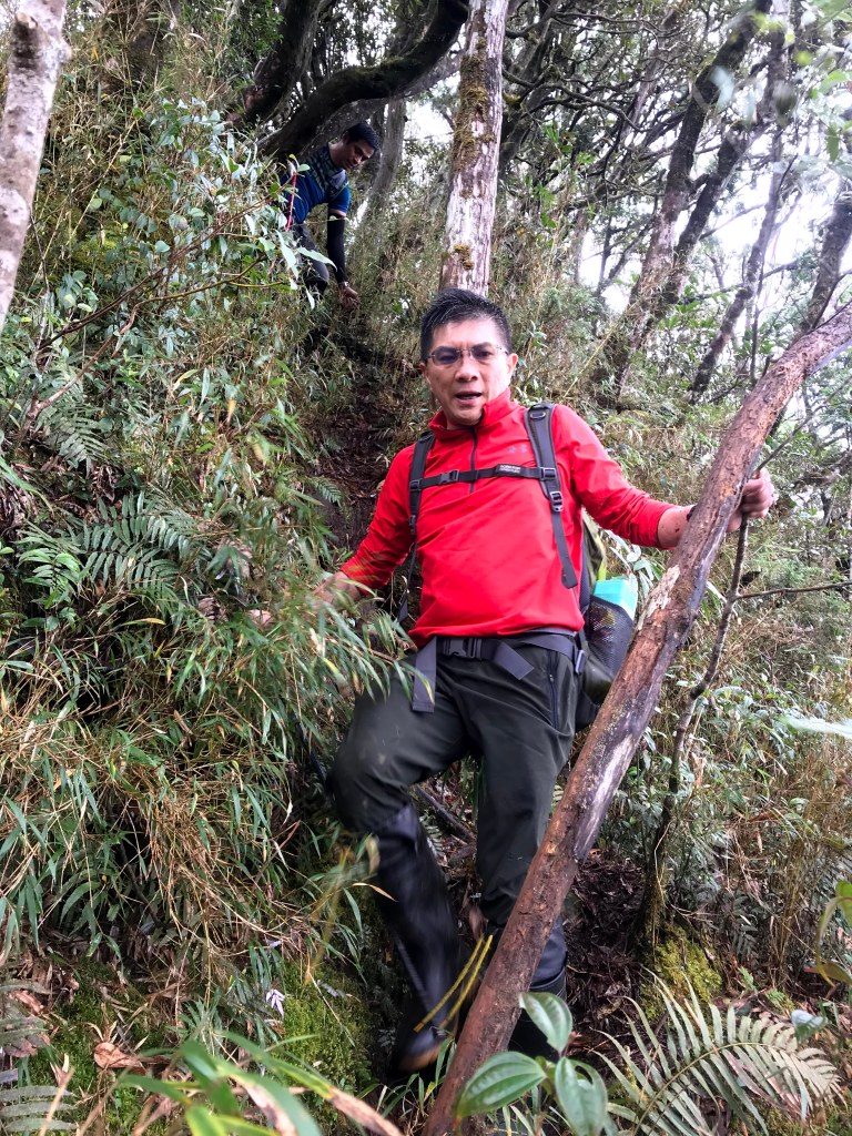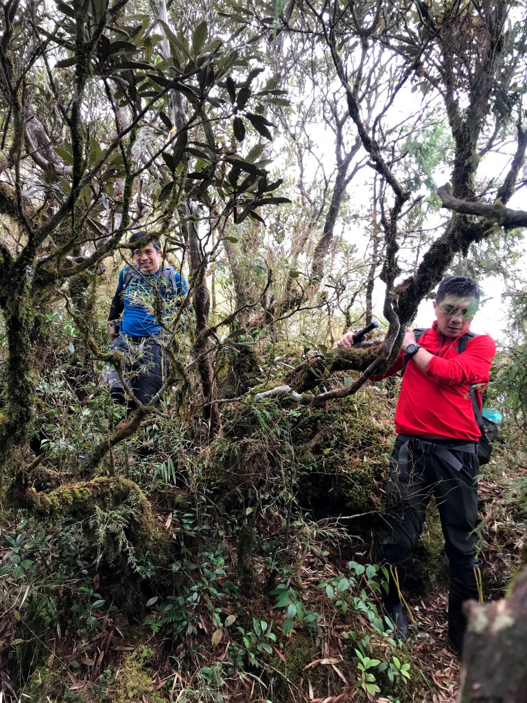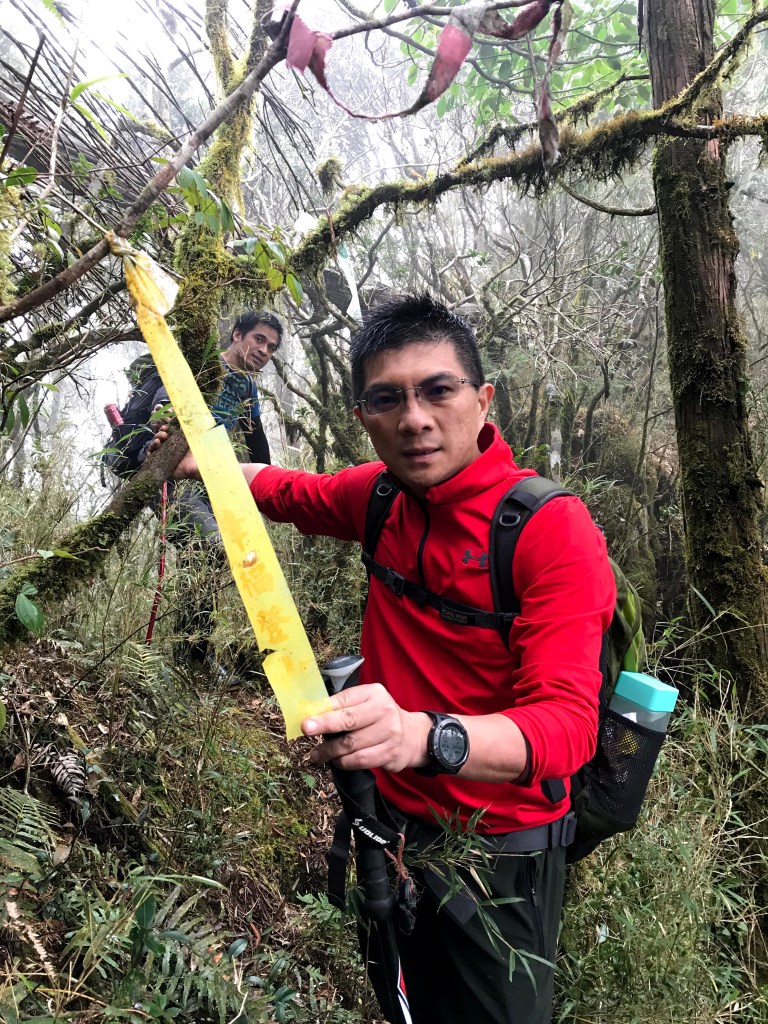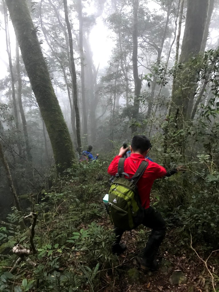 我們的超級Mario,果然不同凡響,在布條有限,且茂密森林路徑不明的條件下,都是一溜煙就不見人影。Smile、Elmer還有我,三人在後面苦苦追趕他們兩人Mario及Kim。但是,偶爾也發現,Mario與Kim會走錯路徑,經過不定時的呼喊來修正,下次會要求每人都帶著哨子或帶著無線電,另外也要不時對著離線地圖。不過,在有岔路時,兩人會先停下來等我們到來確認。結果,原本應該要4小時的路程,只用了2小時55分鐘就到達稜山了。