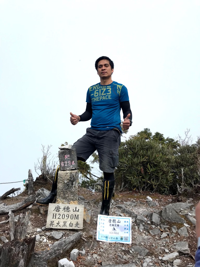 歷經千辛萬苦,以及一小段的繩索攀爬,終於到了唐穗山三角點,這一天的天氣並不好,在山頂上皆是白牆,無展望,其中的一面是斷崖,有拉繩警戒。在此休息吃中餐,煮泡麵,拿出預先準備的白米飯、各式罐頭、香蕉、橘子。與三角點拍照,休息至12:15離開。