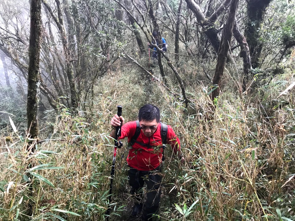 進入稜山三角點前之100m,會進入茂密的箭竹林。到達後,大夥開始拍照、休息,並吃上今天在山上的第二餐,一直休息到15:48才離開。至此,我不安的心理,大致都放了下來。接下來,只要過溪沒有風險,今天的行程應該就會圓滿結束。