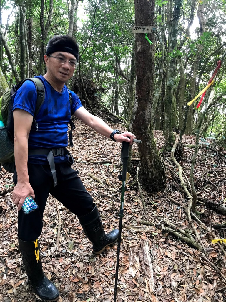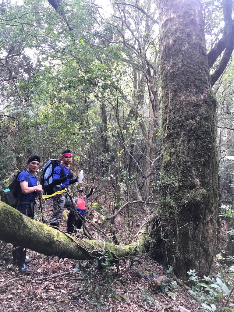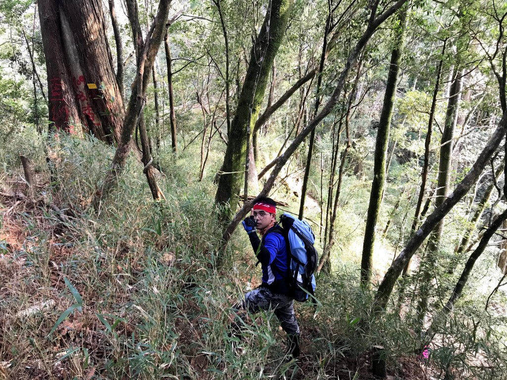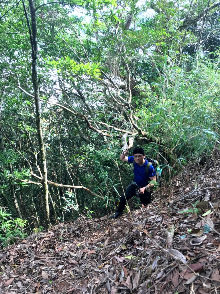 在走到接近1930峰前,突然看見一對穿著單薄男女及一條小黑狗迎面走來,神色緊張的說:他們昨天爬霞山迷路,想折返一直找不到正確的路。聽到我們的聲音之前,兩人還躺在山路上昏睡中,並表明他們已經幾個小時沒有喝水了,因此,我們給了兩人一狗約一瓶的水,並且用APP的Maps.me詳細解釋下山的路徑,確認他們知道路線後,才繼續前進。這部分就花了約半小時。