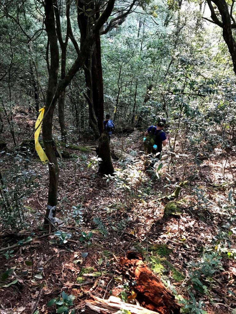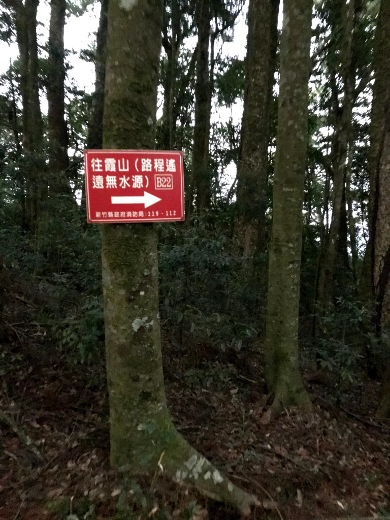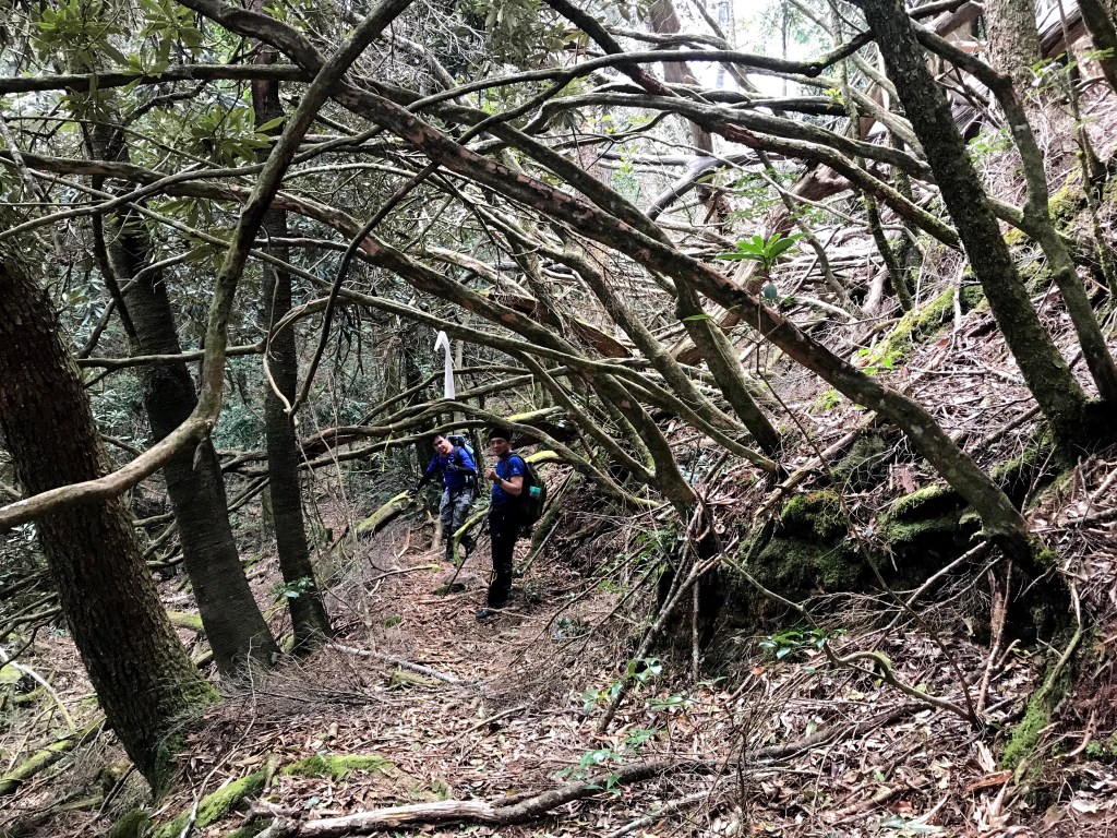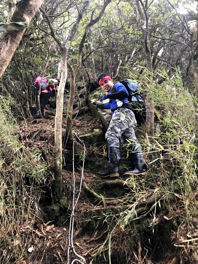 在走到接近1930峰前,突然看見一對穿著單薄男女及一條小黑狗迎面走來,神色緊張的說:他們昨天爬霞山迷路,想折返一直找不到正確的路。聽到我們的聲音之前,兩人還躺在山路上昏睡中,並表明他們已經幾個小時沒有喝水了,因此,我們給了兩人一狗約一瓶的水,並且用APP的Maps.me詳細解釋下山的路徑,確認他們知道路線後,才繼續前進。這部分就花了約半小時。