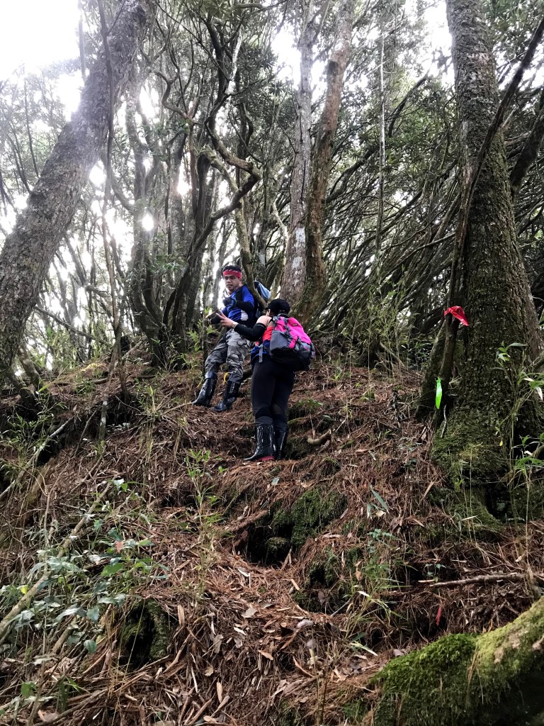 由於這段路徑更為原始,原本預計約要4個小時,結果走了5個小時,因為走到2208峰頂,會是往霞喀羅古道與往麥巴來山的岔路口,岔路口往左下即接霞喀羅古道,岔路口直行即繼續往麥巴來山,但因為沒有路牌,且往左下的布條標示較多且清楚,而直行的布條必須往前10公尺後才能看到下一個直行的布條。結果在這一段,帶隊的Kim與Mario在無法目視到直行的布條下,就直接往左下切而行,而Smile與我在跟隨下也沒特別注意到此種差異,亦直接跟下,導致走錯路線,而在確定後再返回2208峰,此時多走了約2km,亦多用了將近一小時的時間,從15:58至16:51,真是令大夥都氣餒的一段路。