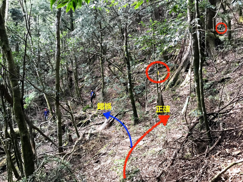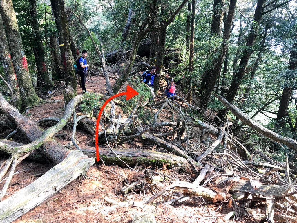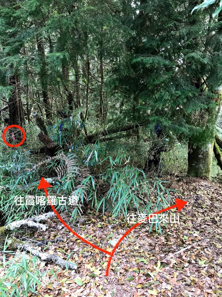 在霞山東南峰往麥巴來山的中間,到達2208峰時會有一條往左下通往霞喀羅古道的岔路,且此岔路口已經不存在路標。當時帶路的是Kim,我也一直忘記要先提醒,結果Kim與Mario在2208峰一看到往左側有布條,就直接往下衝了,而我也沒有注意到,結果走了半小時約走了快1km的路,我突然猛然覺醒,行前就知道這一段到了2208峰後,會有一小段陡下,接著再來就是有上有下,怎麼會走了半小時的路徑是一直往下?晴天霹靂啊!「霞喀羅古道」的字眼突然乍現在我的腦海裡。走錯了!在回走2208峰的路上,我用餘光喵了所有人的表情,我們像戰敗的部隊,回程寂靜無聲且無語。這裡,又多花了將近1小時。這也給其他山友們做參考,在這段路上別走錯了。