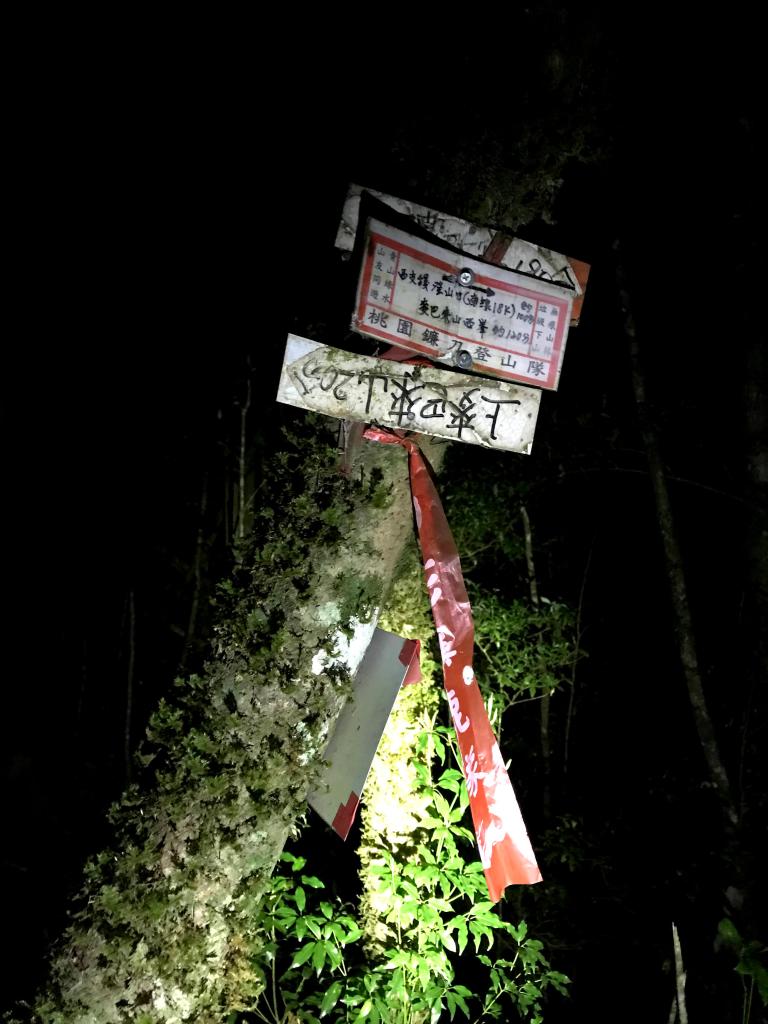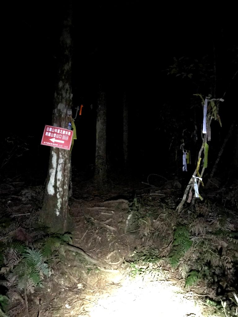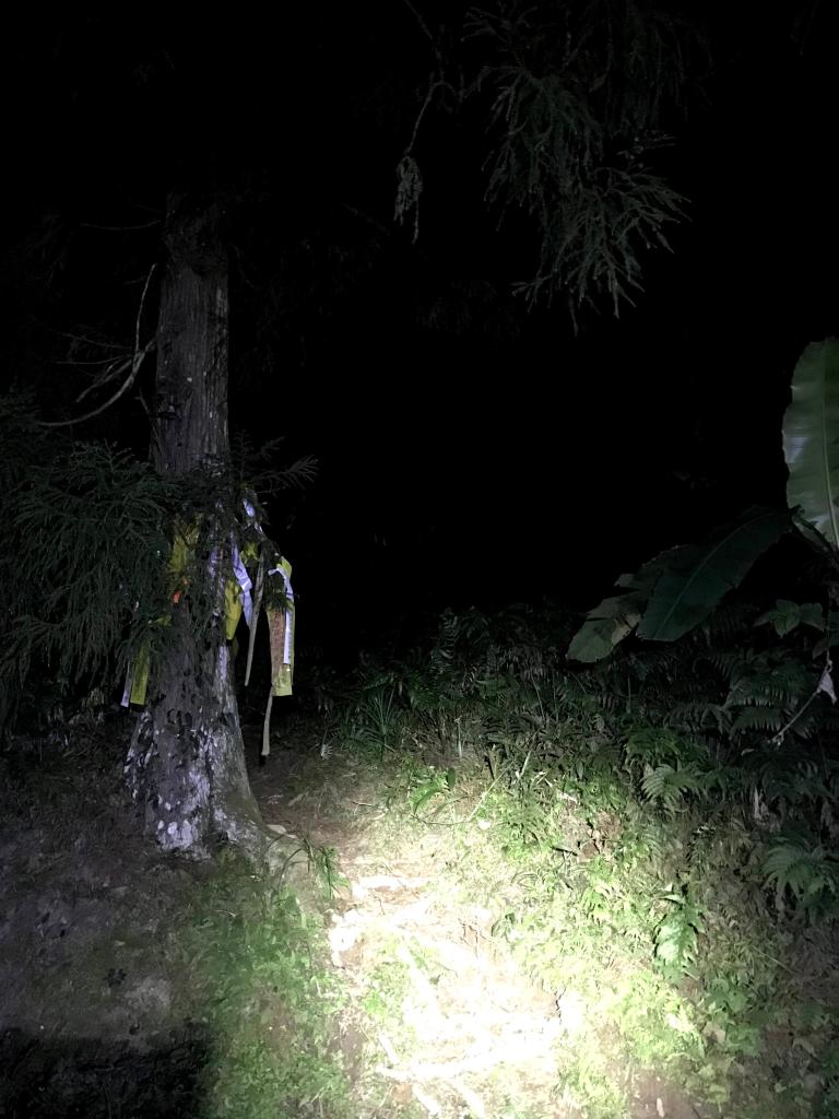 麥巴來西北峰,H1265m,總里程第24.5km。這是今天走到的第五個三角點,反正已經天黑了,當然要拍照留念一下。到了麥巴來西北峰後,再下走400m可到麥巴來山的登山口,再繼續下走500m就可到農改場五峰工作站門口。