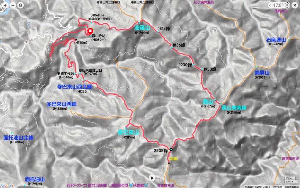 上圖中顯示,由麥巴來山往農改場的過程中,行走300m會先回到霞山與農改場岔路口(圖中顯示之麥巴來山與農改場岔路口),右往霞山,不取,繼續往前。前進約400m會到達麥巴來山西峰與農改場岔路口,左往麥巴來西峰,不取,繼續往前。再前進約200m會到達往羅山林道北線岔路口,右往羅山林道北線,不取,往左下山。接著走2.5km會到達另一個往羅山林道南線岔路口,且中途會遇到一個假三角點,在此羅山林道南線岔路口,往右即往羅山林道南線,不取,往左前續走。再來就是極好走的水平寬廣羅山林道南線,但記得只有200m就要下切往麥巴來山西北峰,不要因為路況極好就一直順著路走,不然又要走往麥巴來山西峰了。再走約500m可到麥巴來山西北峰。再400m到達麥巴來山登山口,再500m就抵達農改場五峰工作站的門口。