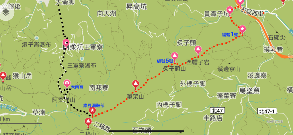 上圖中顯示,在西帽子岩前後,皆有路徑可以通往烏塗窟,有公車可以搭乘。在炙子頭山三角點處,亦即編號5號的位置,往北可通往昇高坑路而到達深坑,往南可通往內楒子腳。