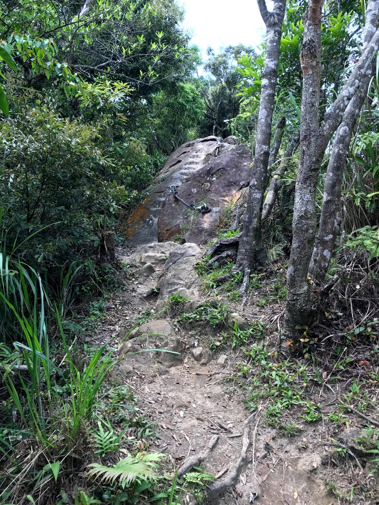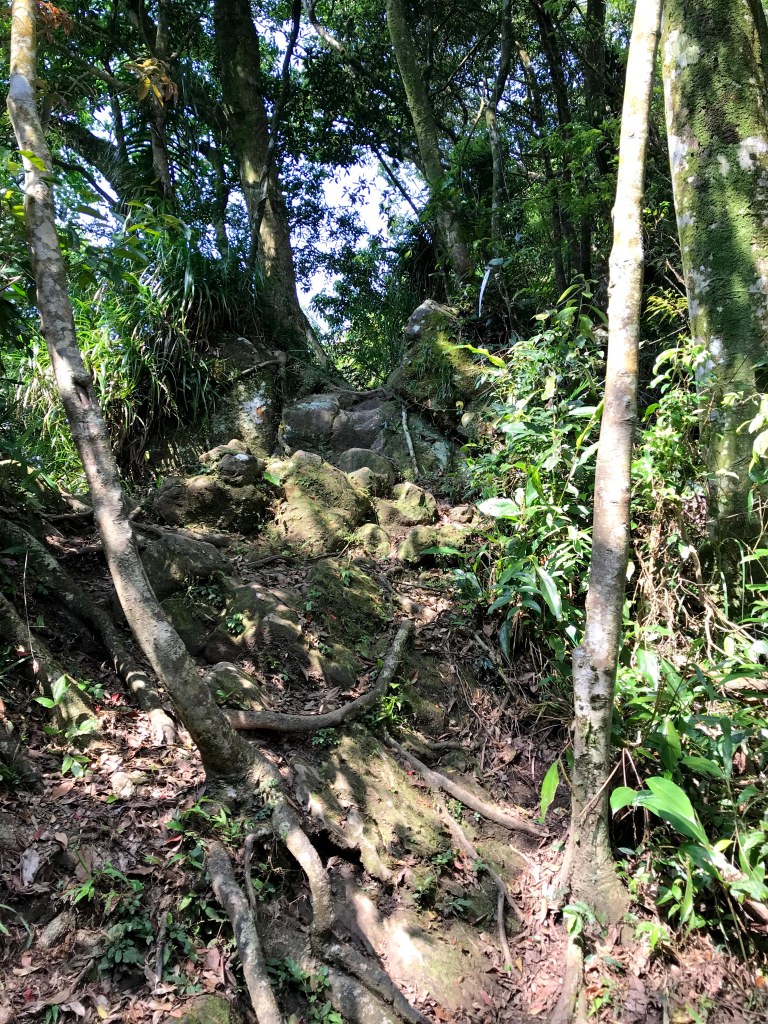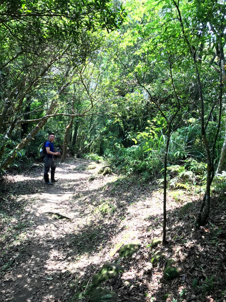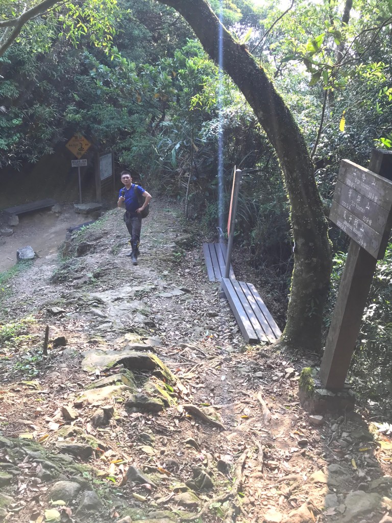 從綠豆湯鞍部後,我們接上猴山岳步道,中間會經過一次岔路,往右續行後,會再遇到另一岔路,但實際上此一岔路已經看不到分岔的路口,因此沿著步道前進一小段即會接上阿柔洋產業道路。