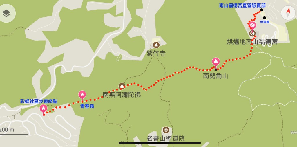 本次的路線,老少咸宜,由第一停車場直上階梯走上300m就會到達南山福德宮,而由南山福德宮走到彩蝶社區的長度約為1.8km,故單趟長度約在2.1km,來回往返總長度約為4.2km。