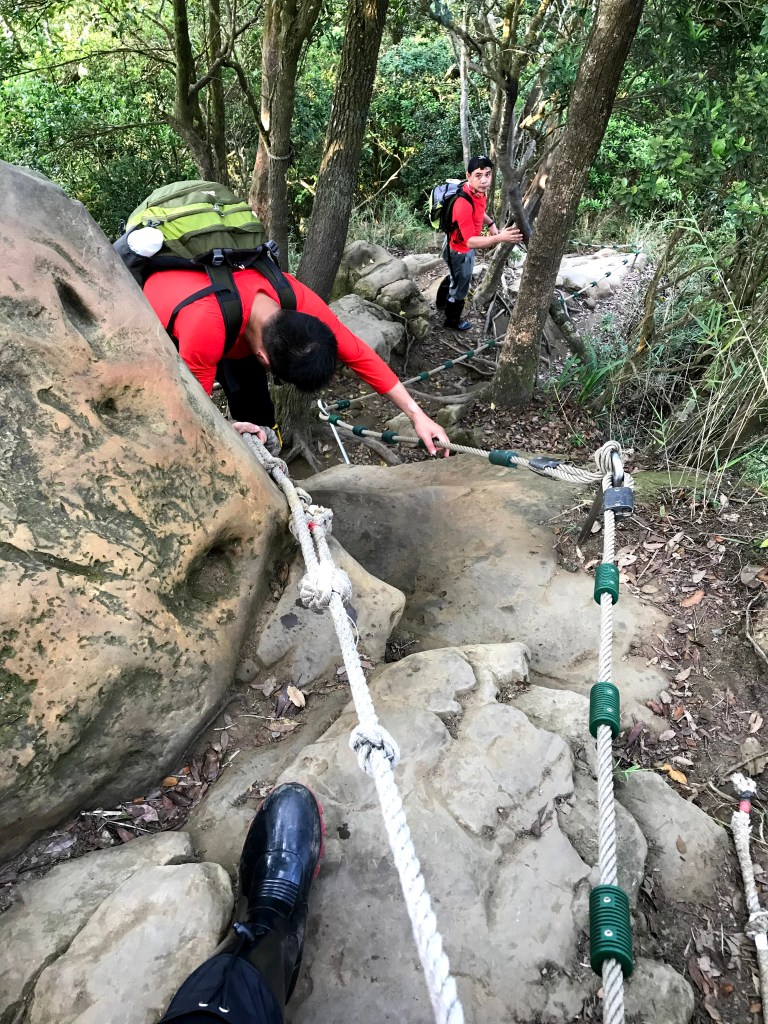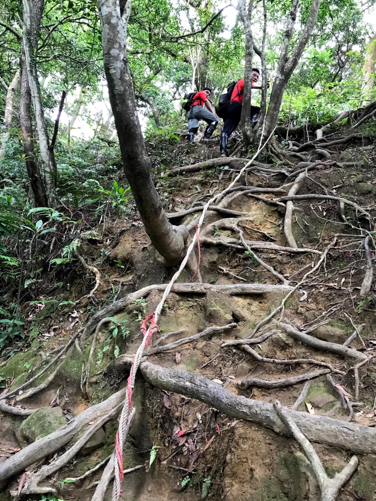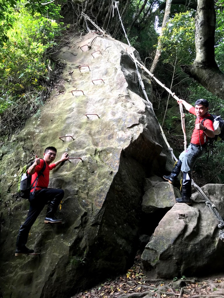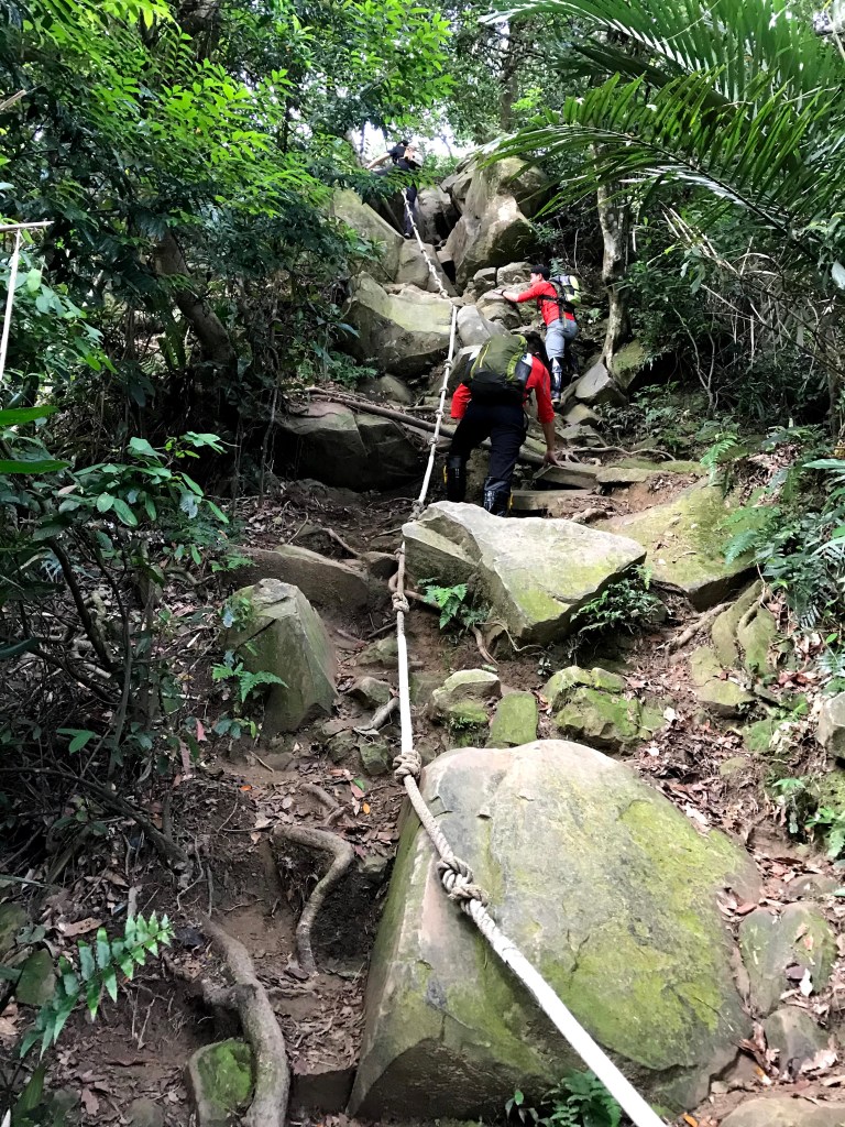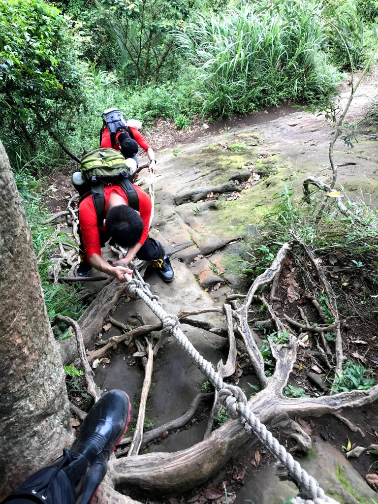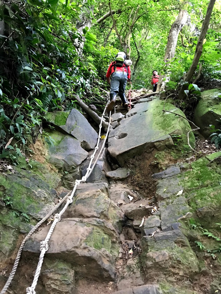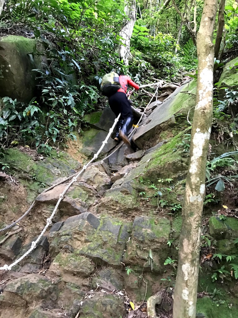 雖然五寮尖O型才約5km,但本次路線難度給中,是因為從玉里商店到峭壁雄風前的這一段路,其實大部分都必須手腳並用,攀爬、拉繩的比例很高。在「拉繩陡上」的這個地點前,其實就已經一直在拉繩陡上了!