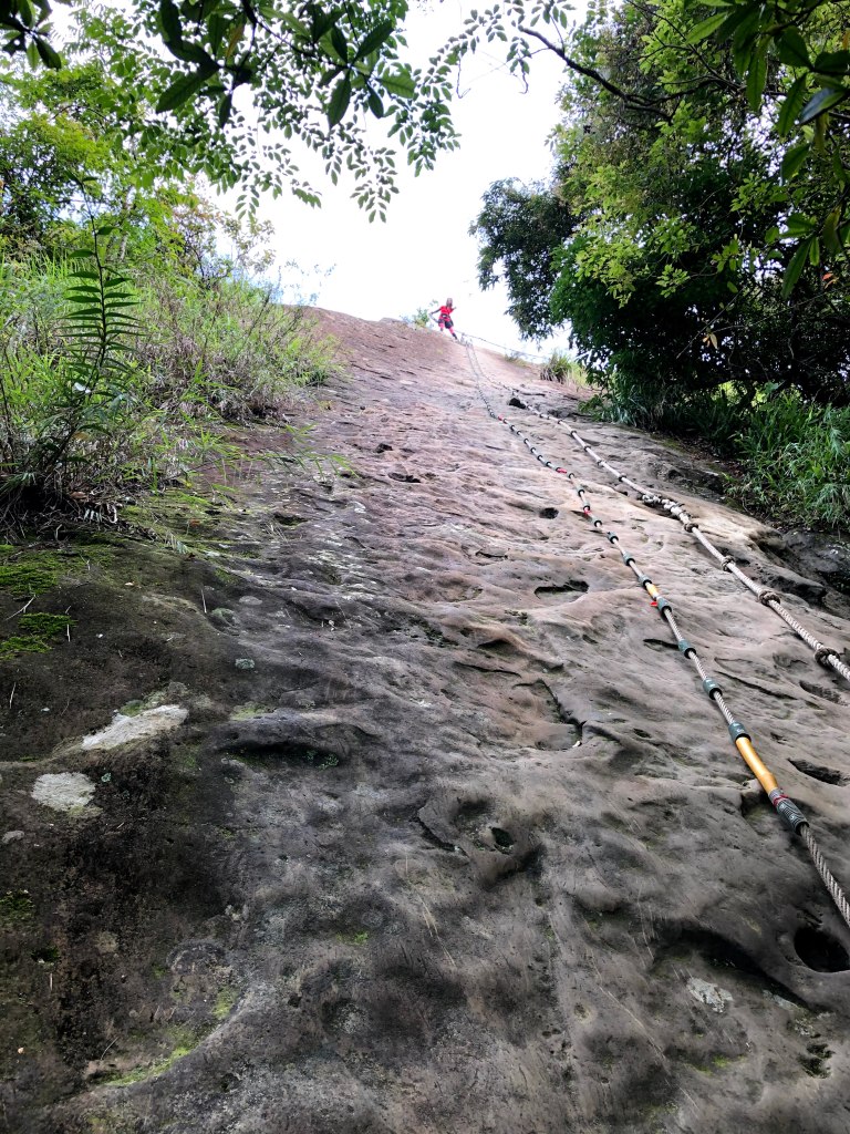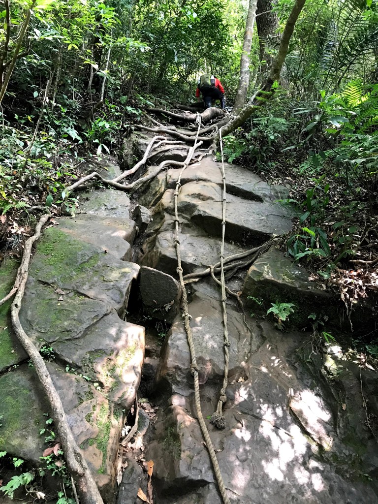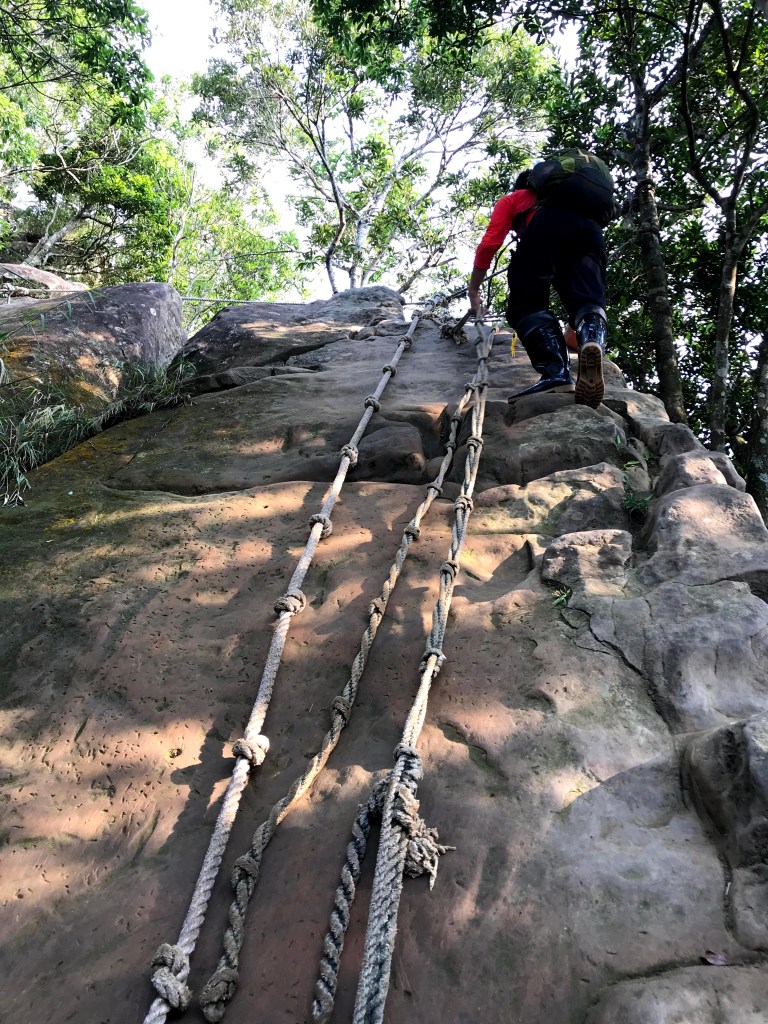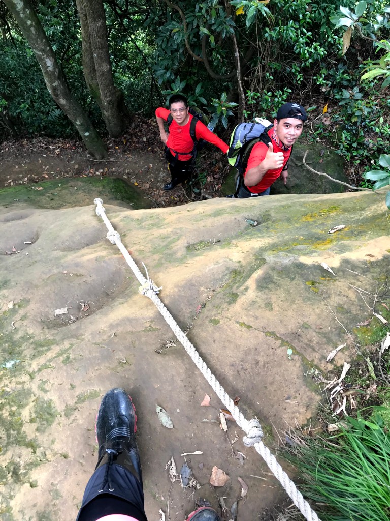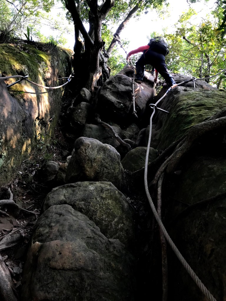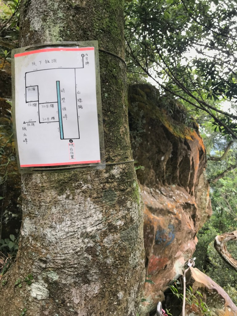 雖然五寮尖O型才約5km,但本次路線難度給中,是因為從玉里商店到峭壁雄風前的這一段路,其實大部分都必須手腳並用,攀爬、拉繩的比例很高。在「拉繩陡上」的這個地點前,其實就已經一直在拉繩陡上了!