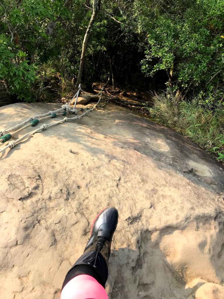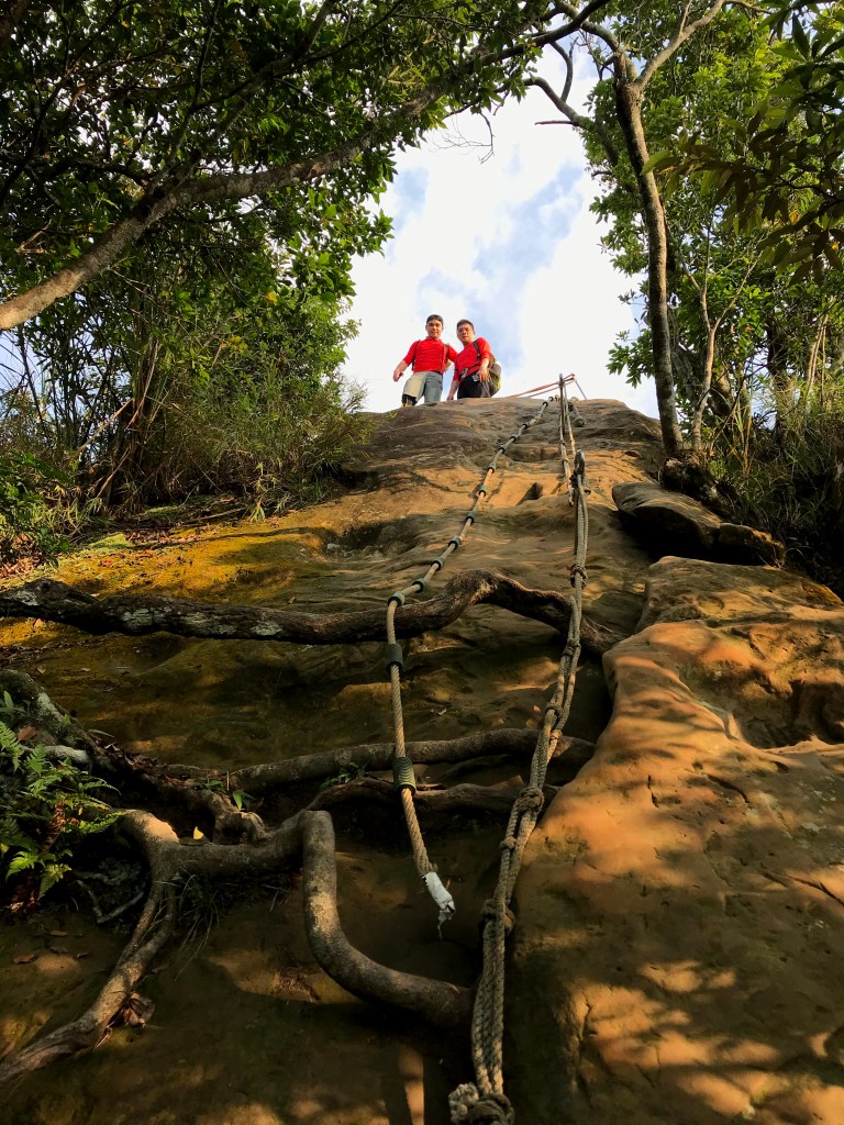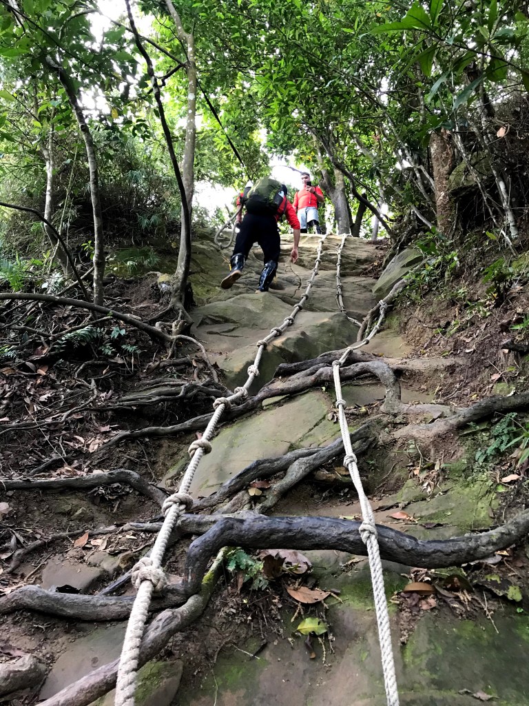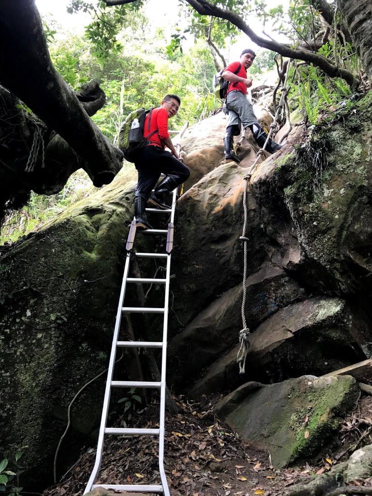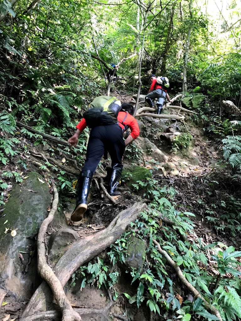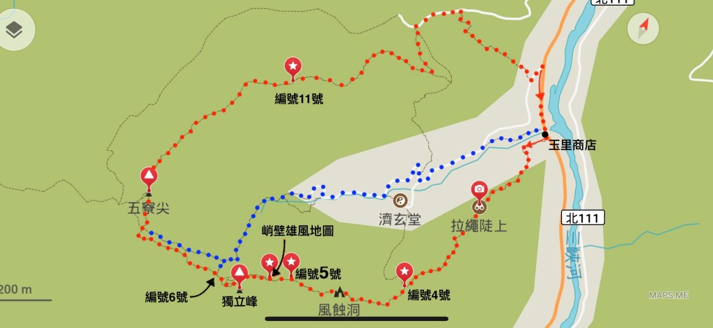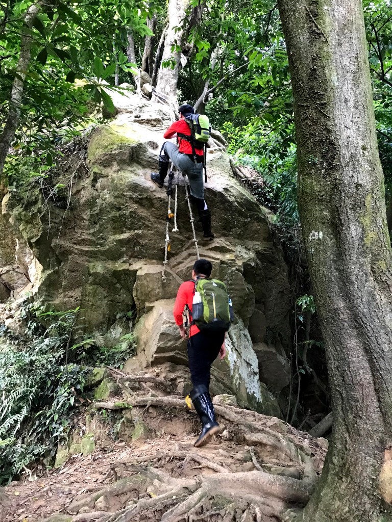 雖然五寮尖O型才約5km,但本次路線難度給中,是因為從玉里商店到峭壁雄風前的這一段路,其實大部分都必須手腳並用,攀爬、拉繩的比例很高。在「拉繩陡上」的這個地點前,其實就已經一直在拉繩陡上了!