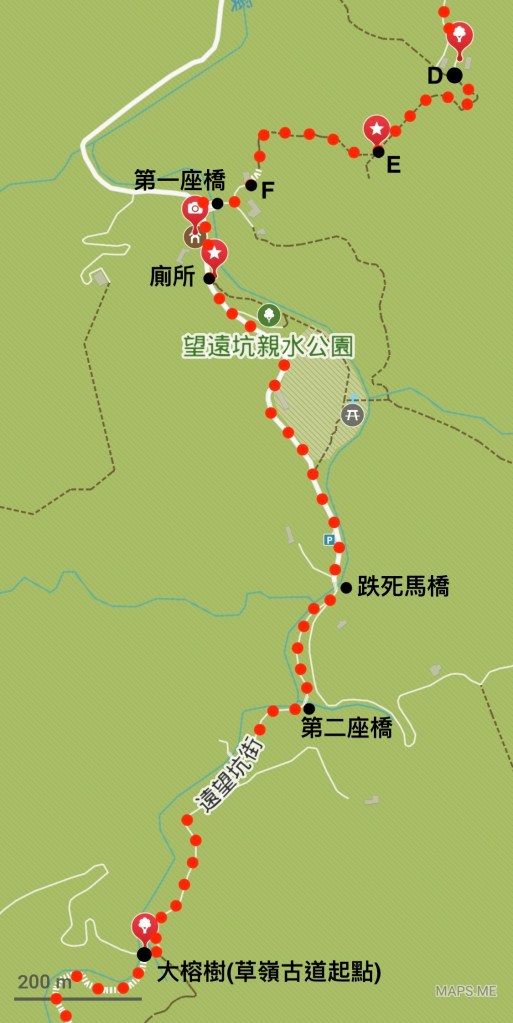 若讀者朋友們有攜家帶眷,那會建議在福隆坐公車到遠望坑親水公園站下車,則可少走2.8km。此時由遠望坑親水公園走草嶺古道,再由埡口下山至大里車站,里程會縮短為6.5km。這樣的難易程度會給:低,但適合闔家共遊。
