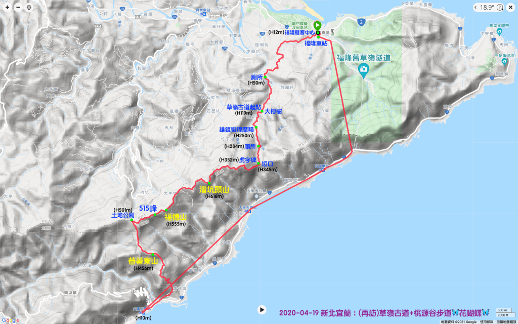 今天的路線,是一條視野遼闊幾無掩蔽的路線,建議朋友們一定要準備防曬的帽子、袖套、防曬油等物品。如果只要走草嶺古道,可走過虎字碑到埡口時,就直接往大里車站方向下山。如此由福隆到大里車站總長約為9.3km。如上圖所示,由福隆沿著紅色路線走到埡口後,再沿者綠色路線下山到大里車站。這樣的難易程度會給:中低。