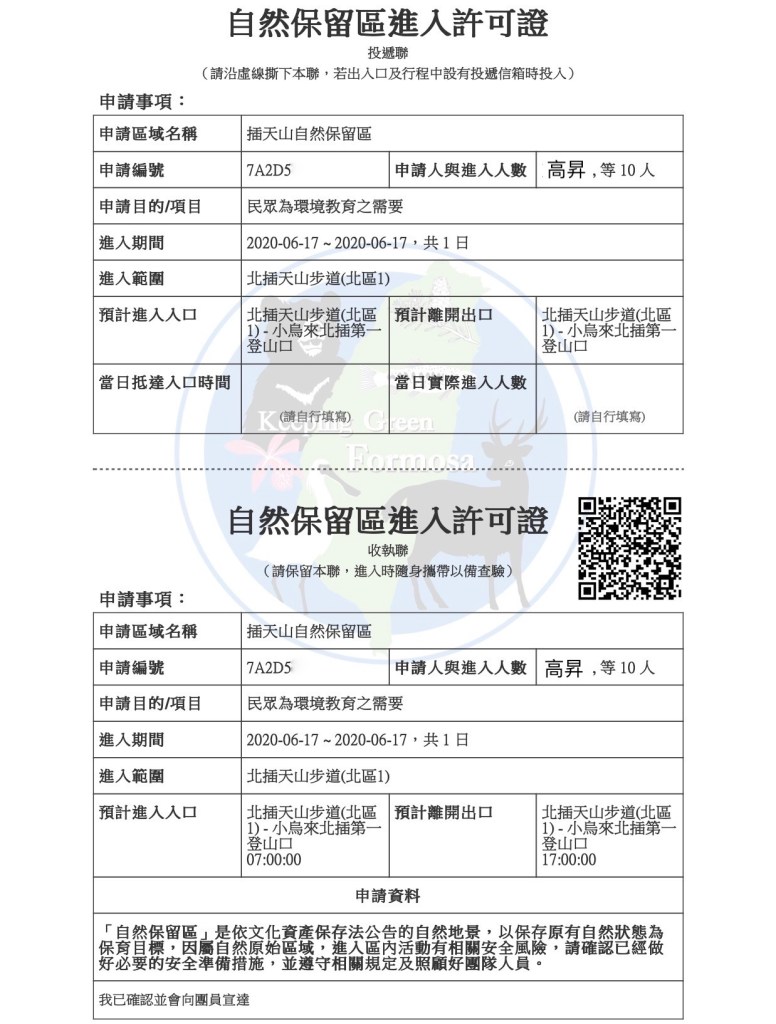 上圖:自然保留區進入許可證。一定要3人以上才能申請,如果登山當日無法至少3人成行,則不得進入自然保留區。