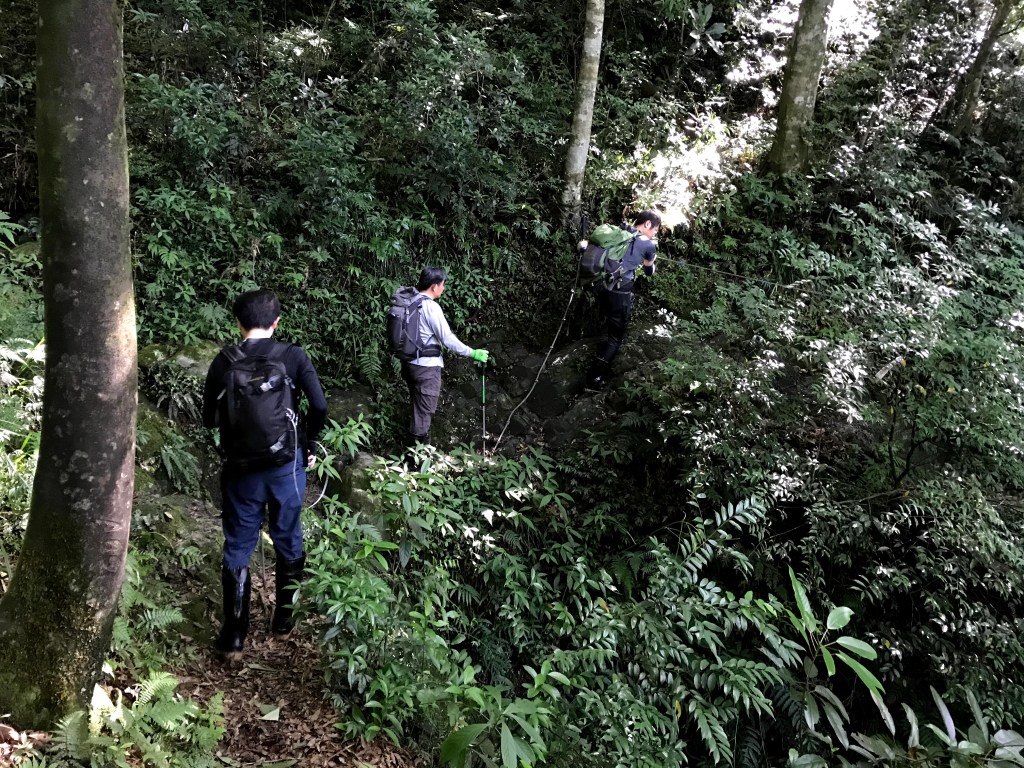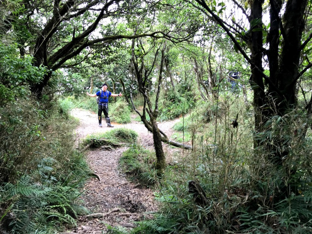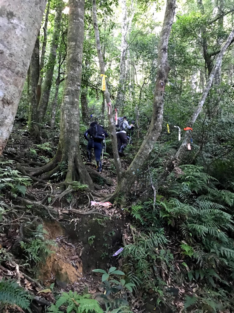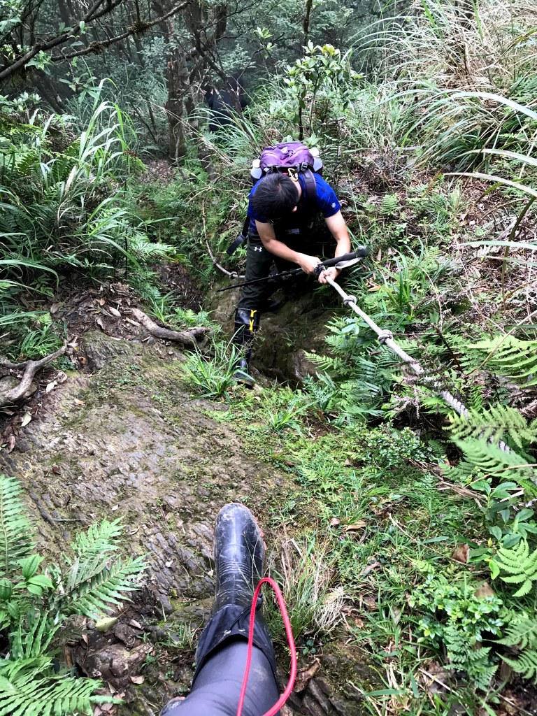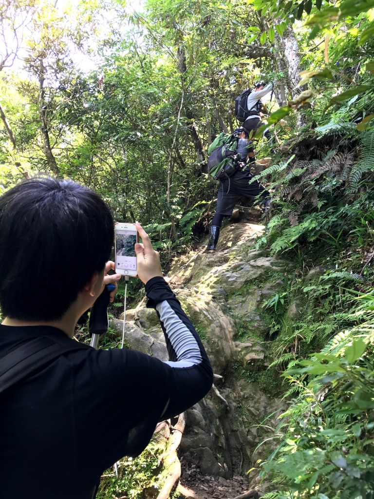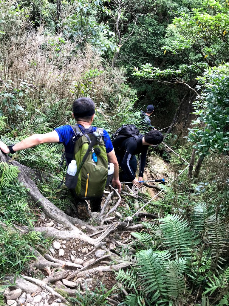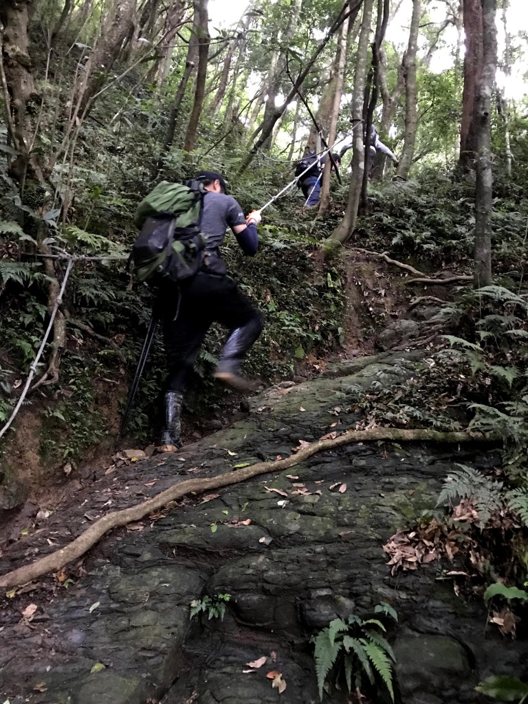 上圖:追到了吳大哥與Nick。這段下山的過程中,Nick與David的速度變得慢了,也許第一次走中級山,時間已經比較久。但是我們不要求快,因為安全才最重要,尤其是在這段路上有一堆的樹根、岩壁。15:24