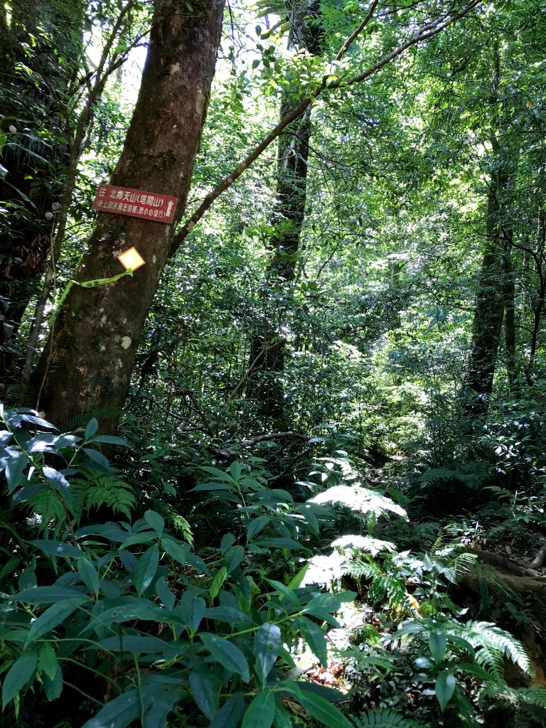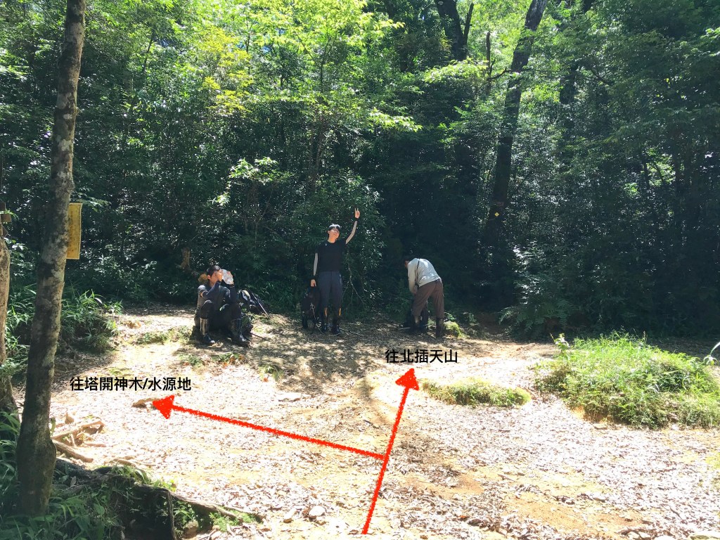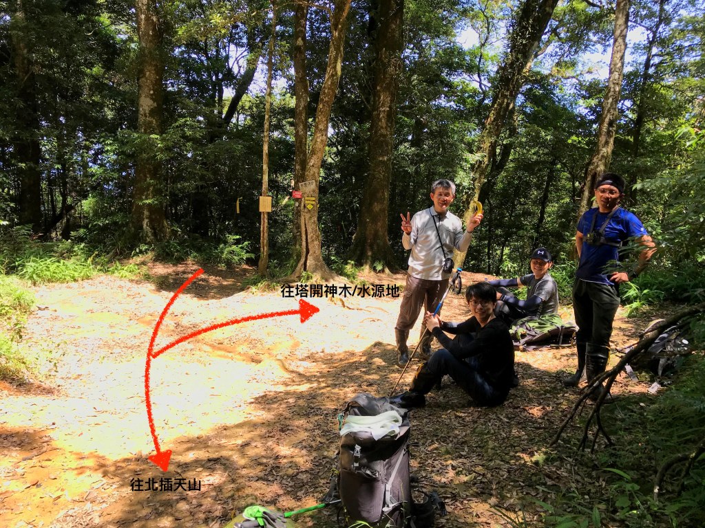 上圖:木屋遺址。往前走,樹上有個黃色標牌的方向,就是往北插天山。往左,是往塔開神木及水源地,這是等會我們下山回到木屋遺址時,我們要行進的方向。