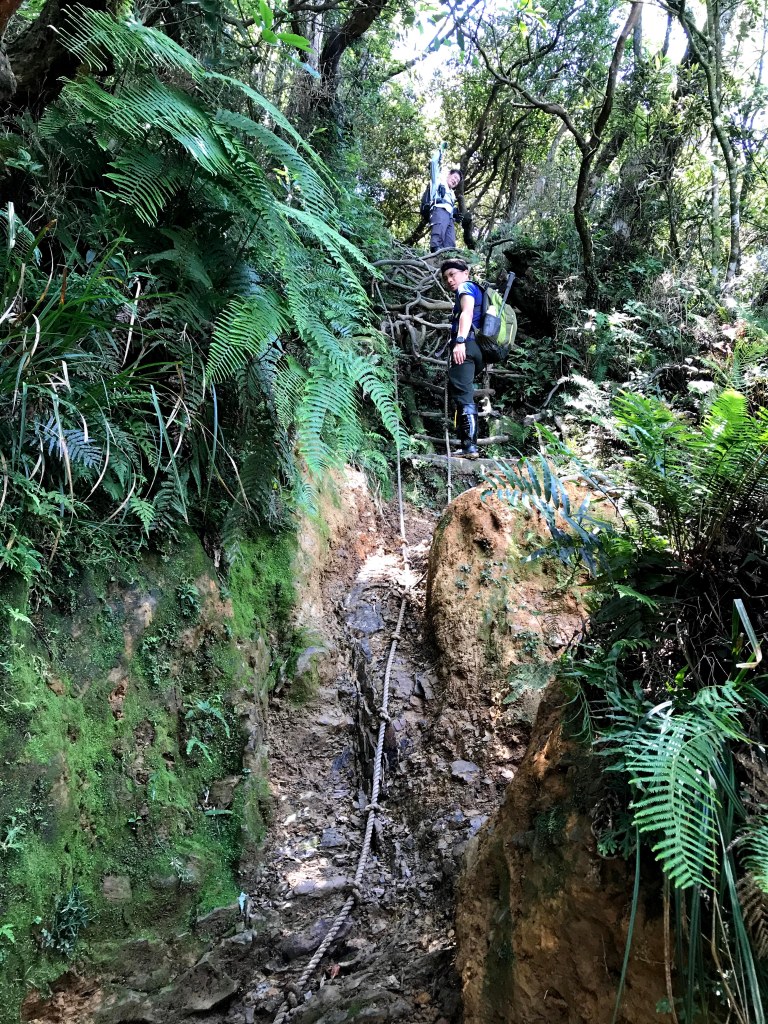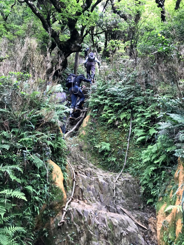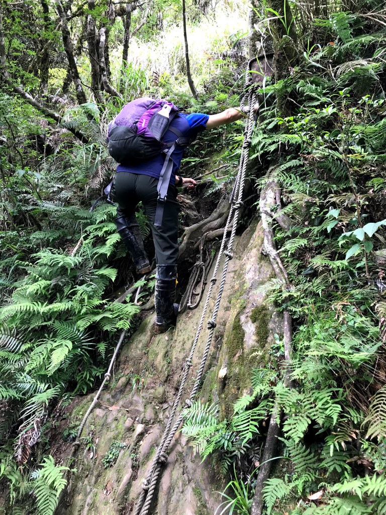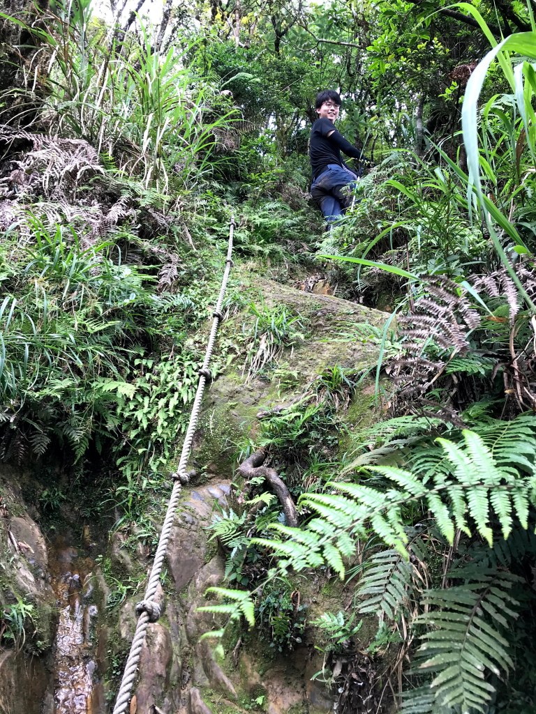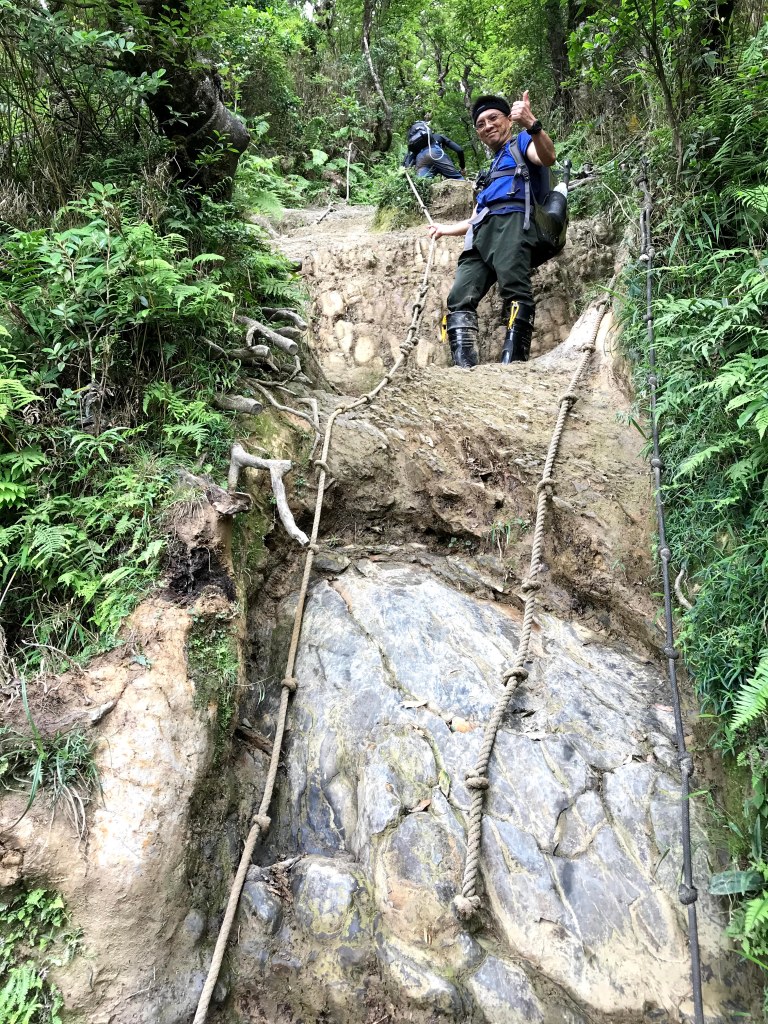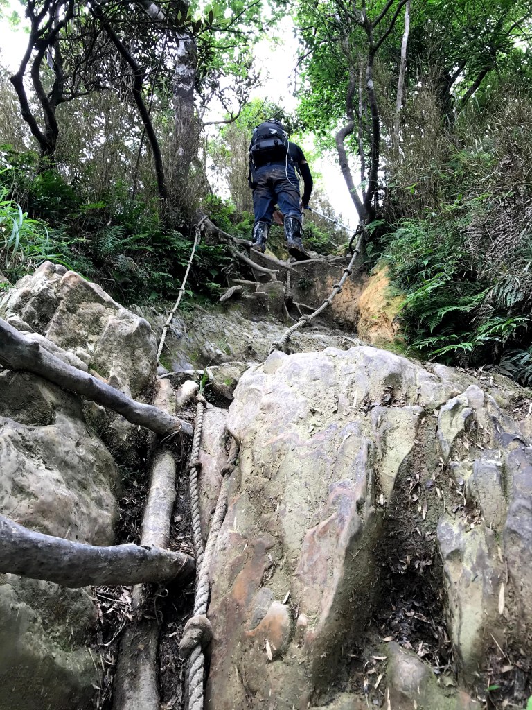 上圖:利用繩索向上攀。Nick在這一段路上,也許是以前沒有爬過中級山,走得比較猶豫一些。11:12