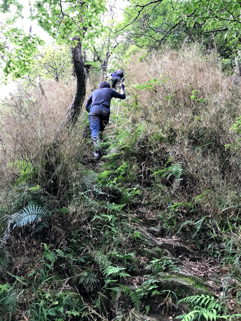 上圖:北插天山由小烏來路線上來,從起登到木屋遺址前,就是一般的山徑且會經過赫威神木群,從木屋遺址開始到北插天山三角點,就是1.3km的一直陡上,要從H1280m一直爬升到H1727m,如上照片所示即為爬升的部分地形。