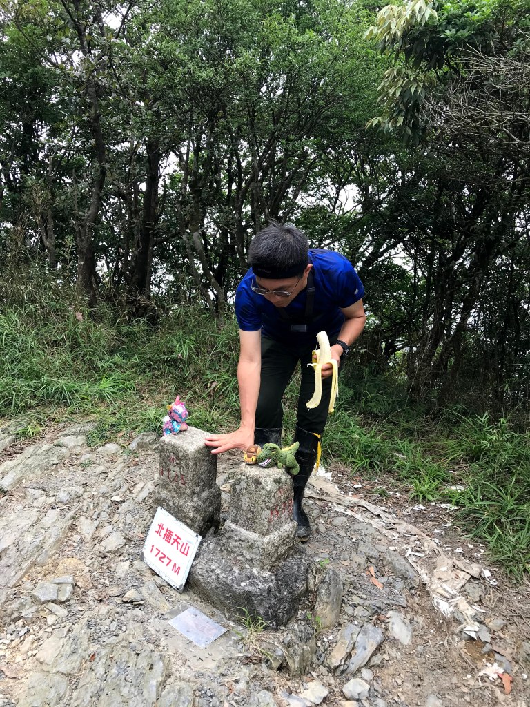 上圖:回到北插天山,三角點上的恐龍、獨角獸及龍貓,是我們的吉祥物。看到他們,就表示我們花蝴蝶來了。13:44