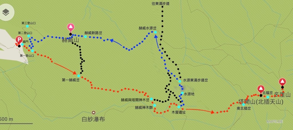 上圖:我們今天的路線,是由停車場經由第一登山口,再到赫威神木群,經木屋遺址,直上北插天山,順撿多崖山,亦即紅色路線。返回北插天山,回到木屋遺址,經由水源地,往赫威山或第二登山口走,即可回到停車場,亦即藍色路線。由圖中可看出往北插天山的過程中岔路頗多,要登北插,一定要對路線的功課作足。