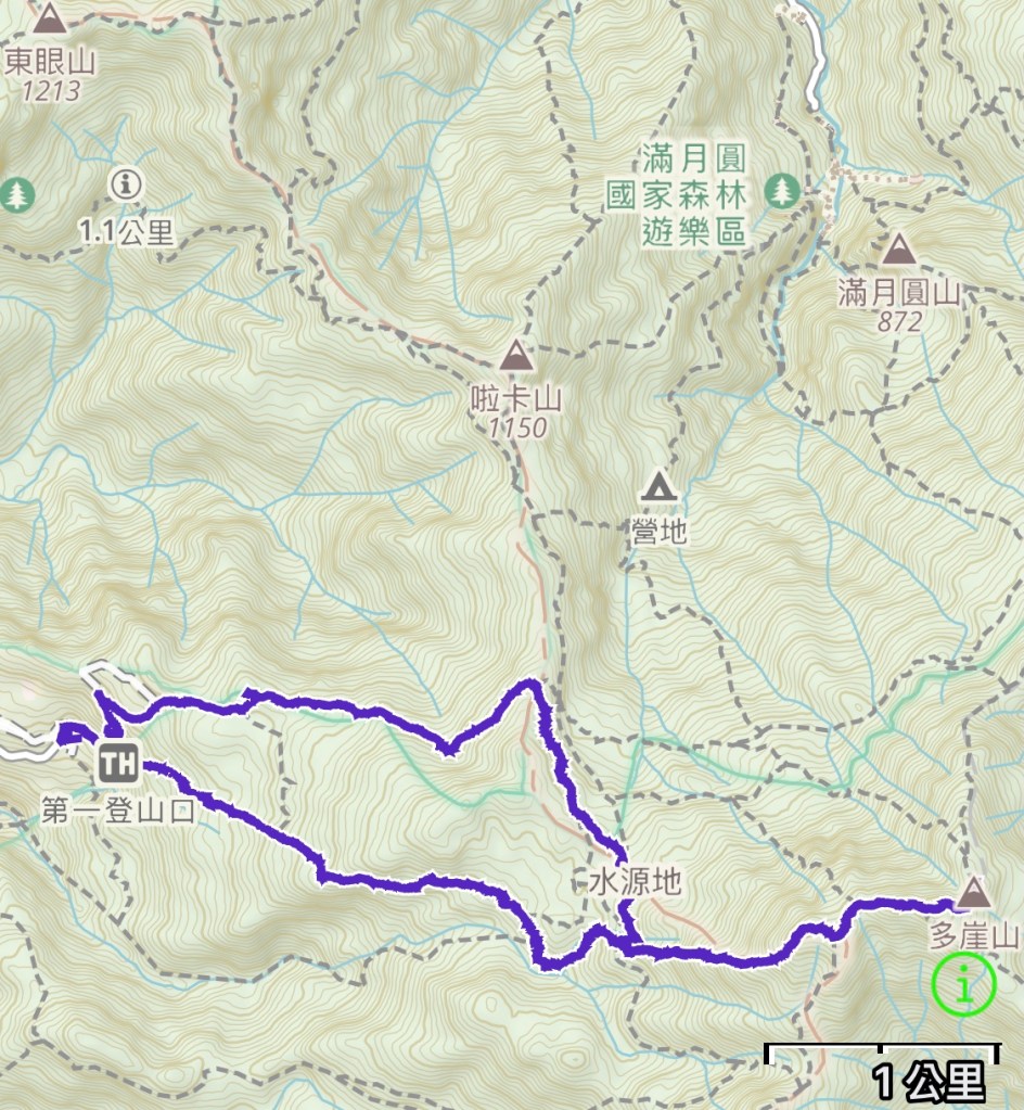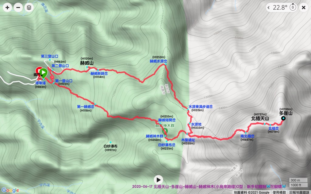 上圖:由Garmin Fenix 6X所紀錄的等高線圖。由停車場經神木區到北插天山需要4.8K的距離,而北插天山到多崖山來回需要900m。回程由北插天山走赫威山方向下山還需要5.8K,故總里程為11.5K。