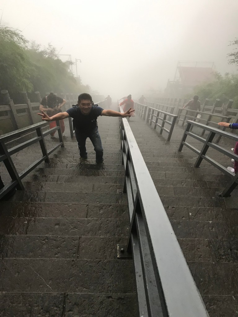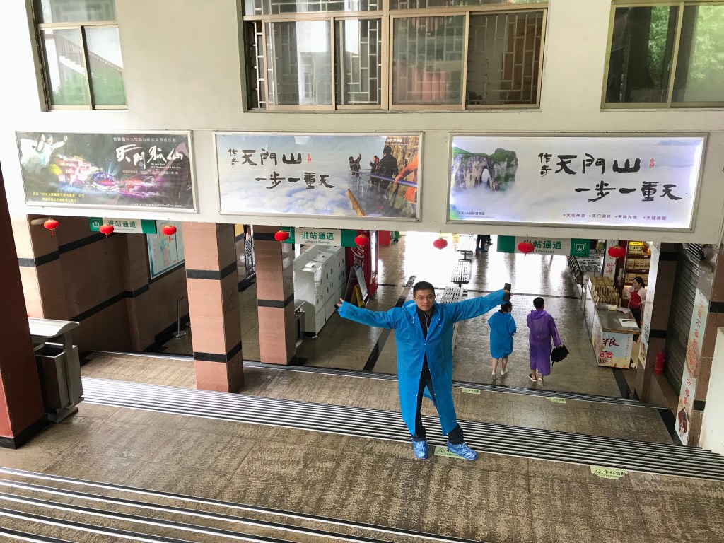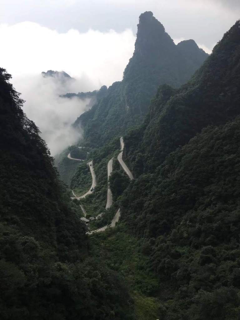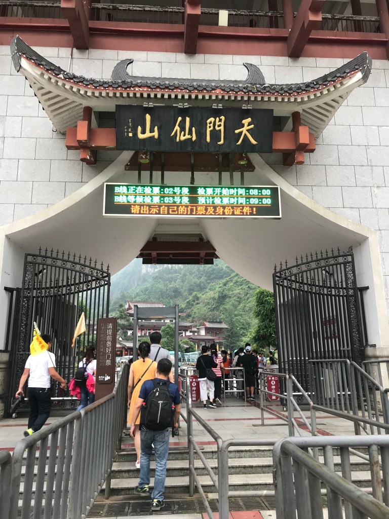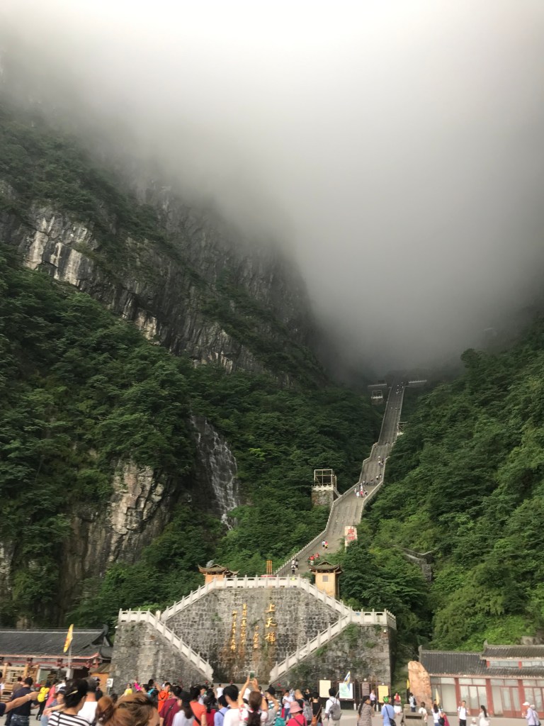 早上在天門山纜車廣場集合,先搭専門的緑色小巴到天門山售票處,路中會經過99彎的洗理,這些師傅的技術很好,但開得飛快,乘客一路上驚聲尖叫。到達天門山廣場,只可惜,天候不佳,最重要的天門山洞看不到,買好票,直上天門山手扶梯,這需要50分鐘,可以想像它的長度與高度。