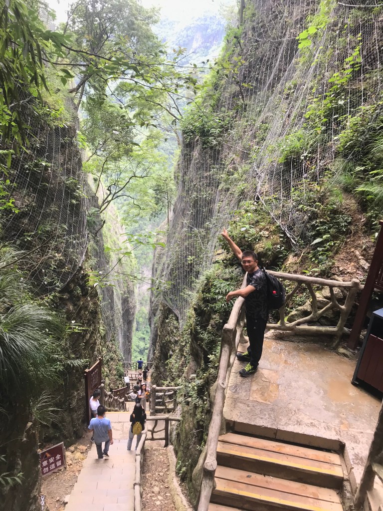 四點後往大峽谷邁進,會先進入一線天峽谷地型,非常的美!由最高處走到最低處,接著要穿護背的衣服,因為有長長的溜滑梯等著你,到底後,就是一段長長的峽谷地形,可以讓你看到瀑布、急流,這一段也是不可多得且盡收眼底的美景。但是要看晚上六點前搭最後一艘船,美歸美,但步閥可不能遲緩。船撘到更下游的停車場,再搭原來的小巴開40公里回張家界市區,晚上八點回到市區。