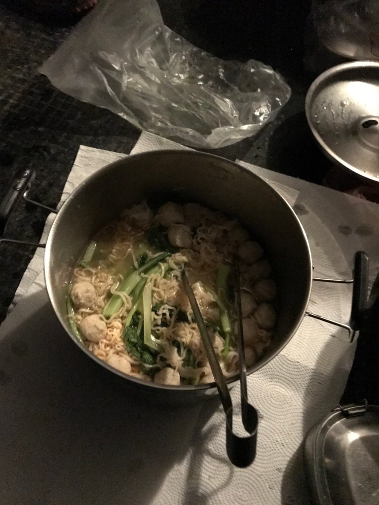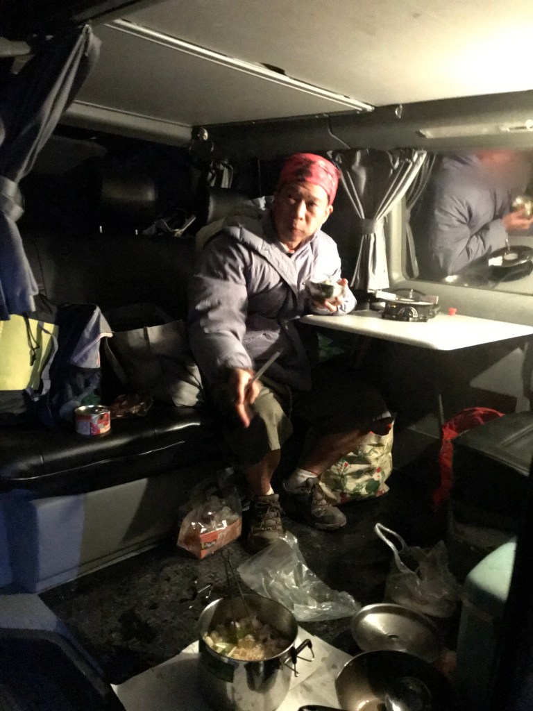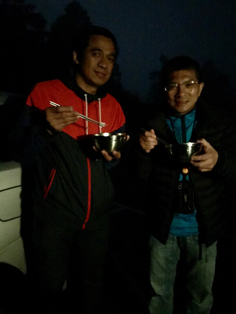 回到停車場後,發現停機坪停車場今晚超熱鬧,停了一堆的旅行車,有好幾位大哥大姊們,看到我們這麼晚才下山,直問我們吃飯了沒?實在是下山趕路太緊湊了,當然就要給這些大哥大姊們請一頓晚餐,哇!在此寒風刺骨的當下,熱騰騰的火鍋雜燴真是吃得好爽!但Smile因為手痛,只好由我餵她吃一些。