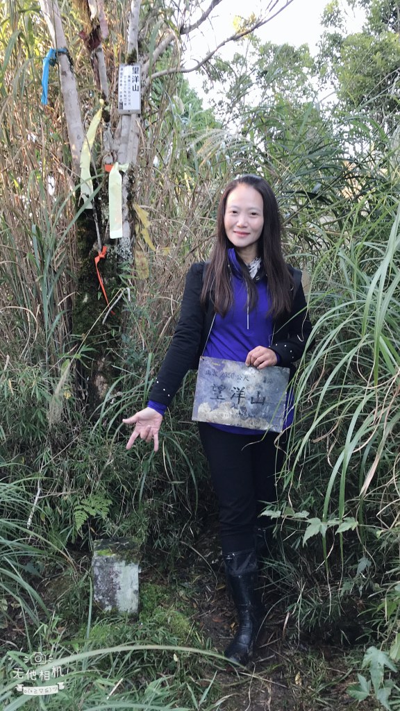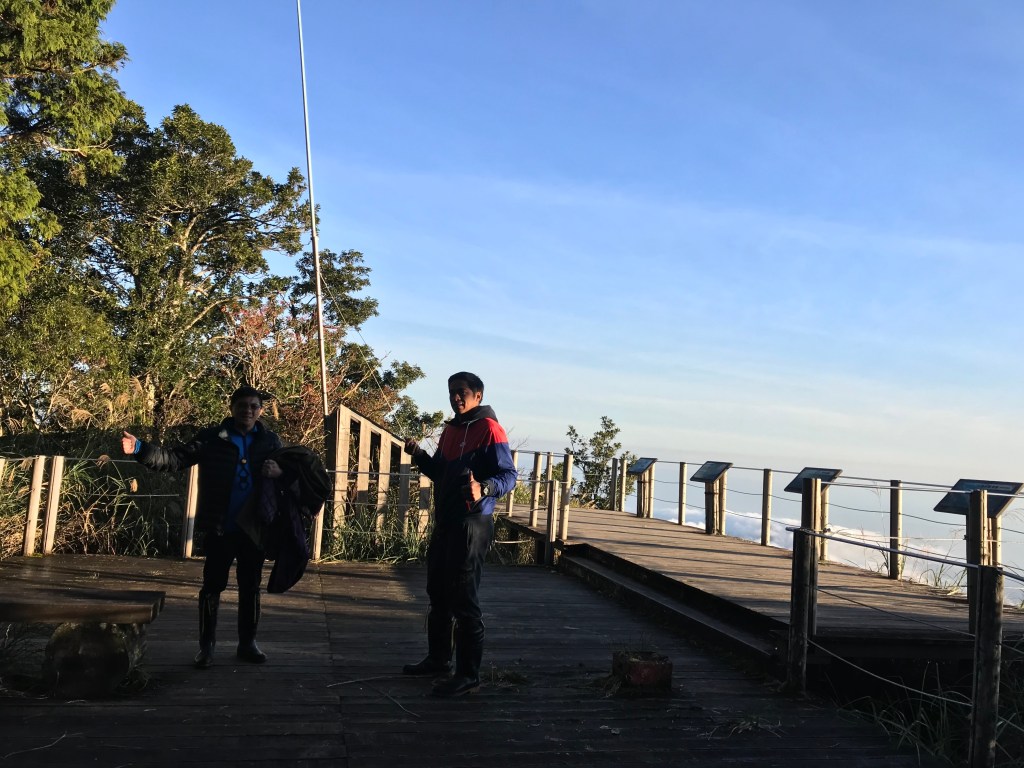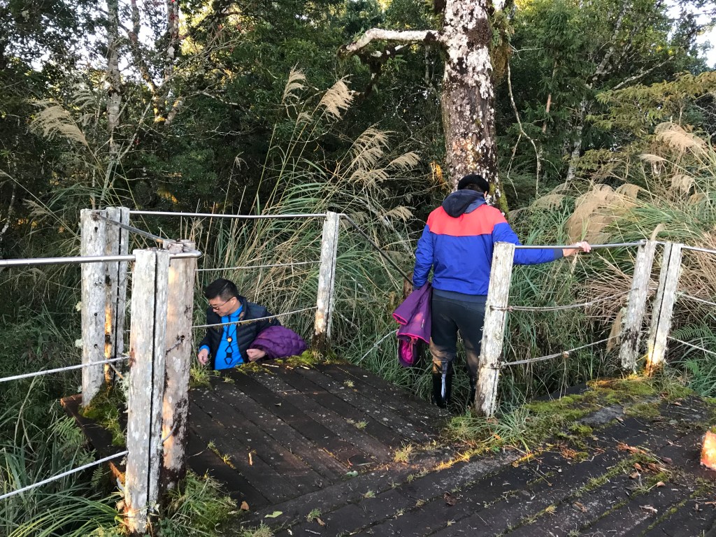 早上約5:30起床盥洗加整理,於5:47起登,先去望洋山看日出,順道拍三角點。我們穿的登山雨鞋,什麼路都可以適應,就是不能適應觀景台的木板平台,結果Smile摔了一大跤(來之前,宜蘭已經下了一週的雨),我認為左手應該扭到了,我說今天的行程放棄吧!結果,Smile說:她一隻手也可以爬。事後,回到台北後去看了骨科才知道,Smile的左手肩骨部分骨折了,可是當天還是這麼倔強的完登。