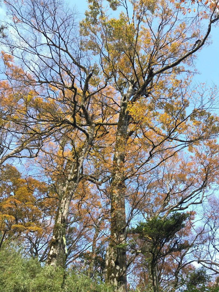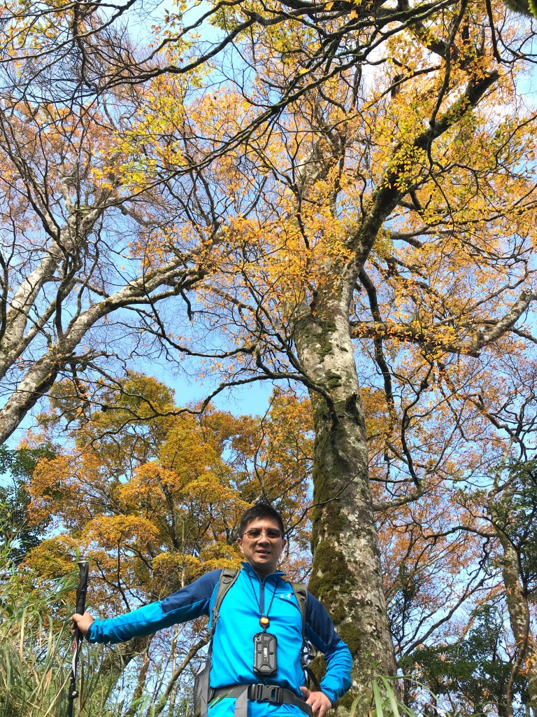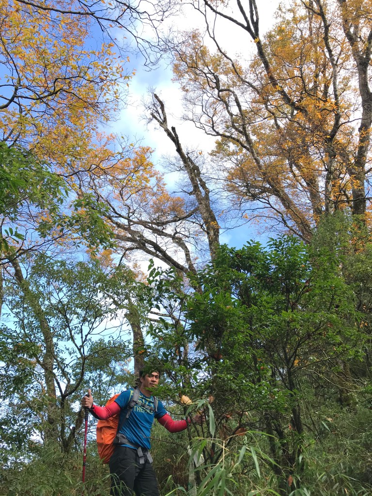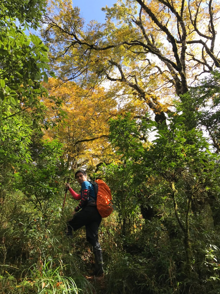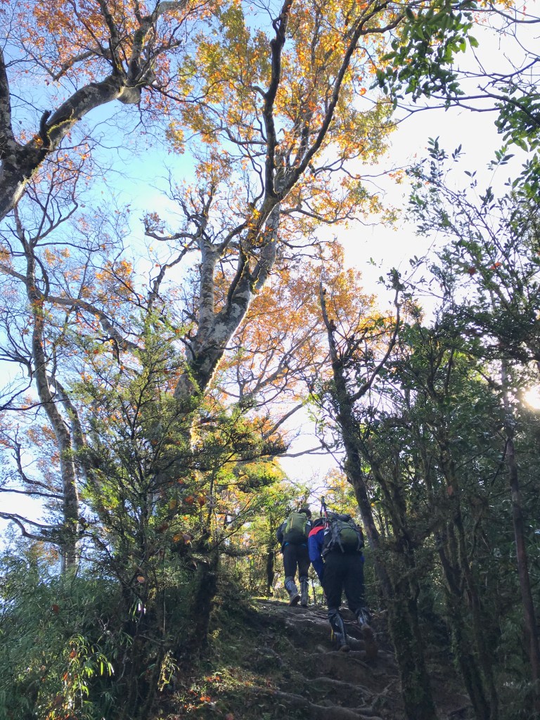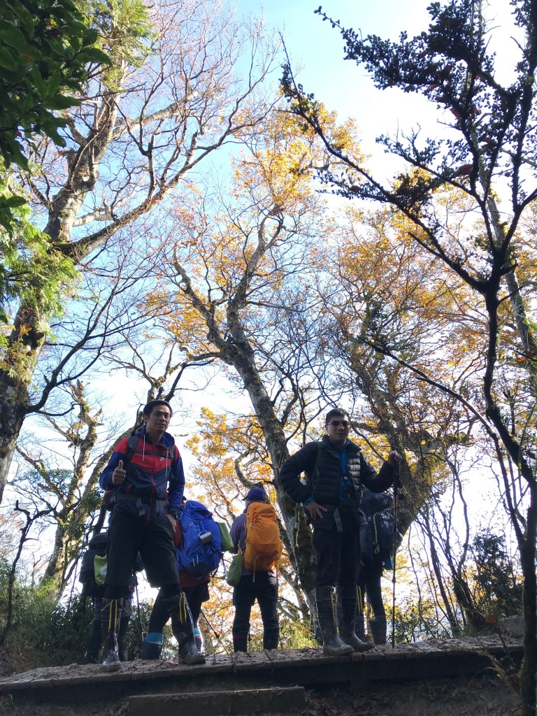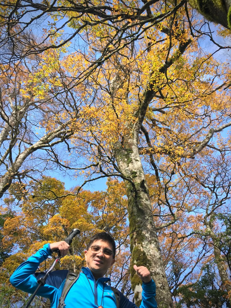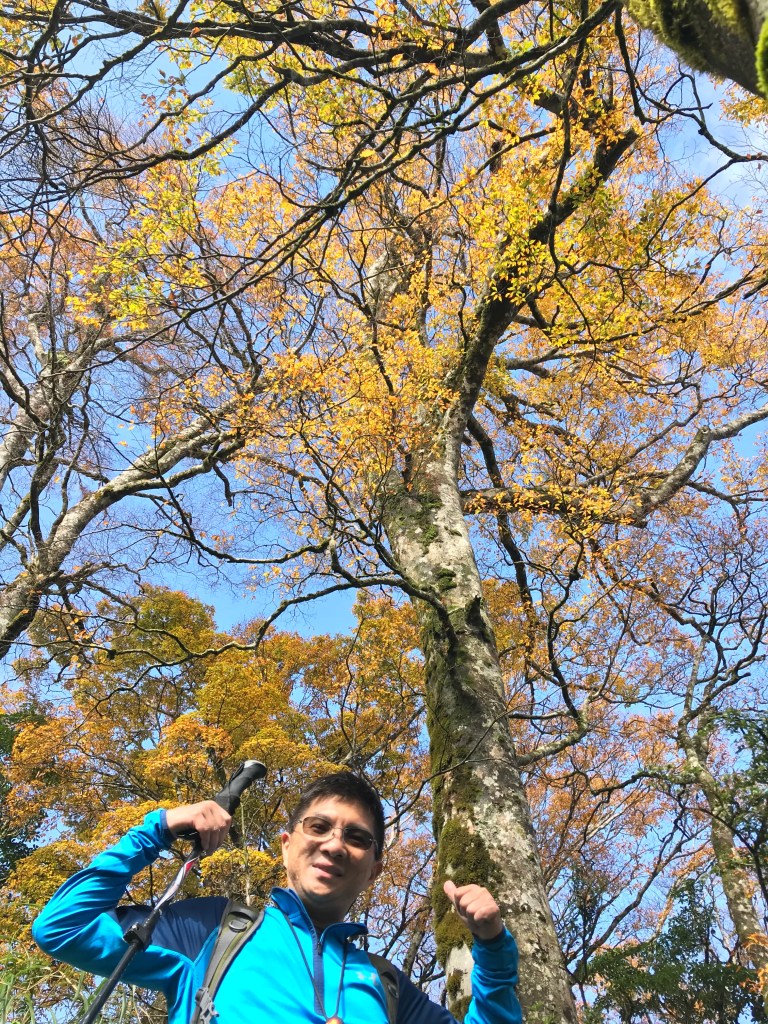 約7點回到翠峰山屋前直昇機坪停車場,Pearl已經煮好早餐等我們,吃完早餐加寒暄一下,在約8點開始由「山毛櫸國家步道」起登,此步道長3.8公里,從3.0公里到3.8公里觀景平台前,是欣賞山毛櫸樹葉轉金黃的黃金路線,也是幾乎所有到此一訪的人的終點,卻是我們爬銅山的人的起點,一路上我們三人不敢休息,說真的,連喝水的時間都省了,一直到銅山的三角點,才發現我自己喝不到200 CC的水。