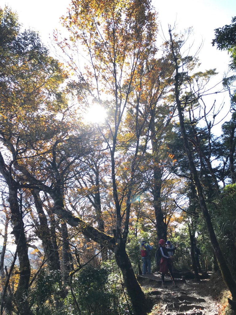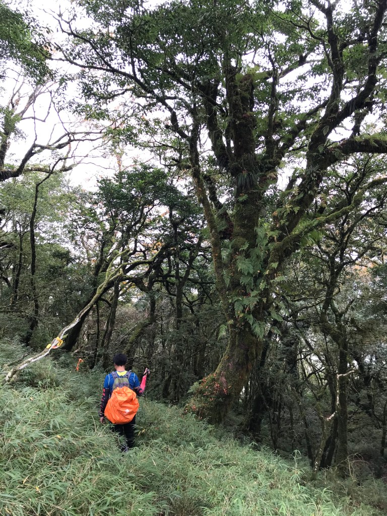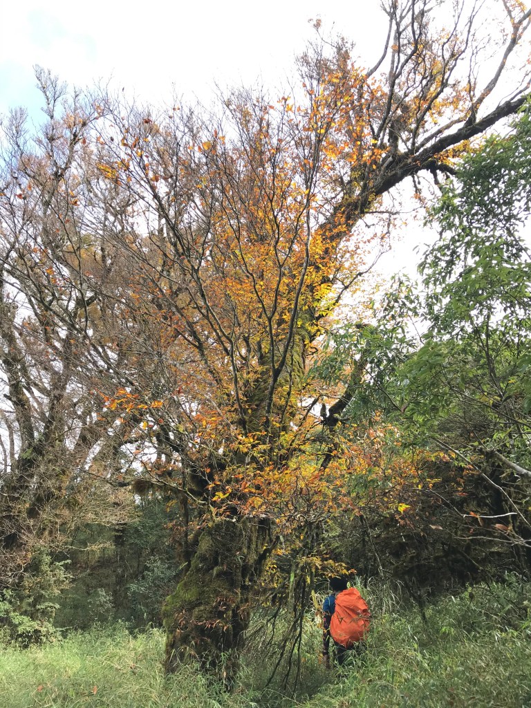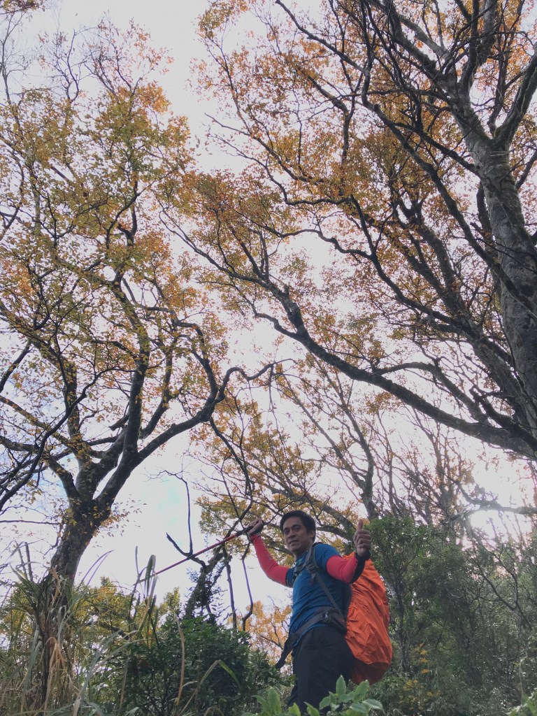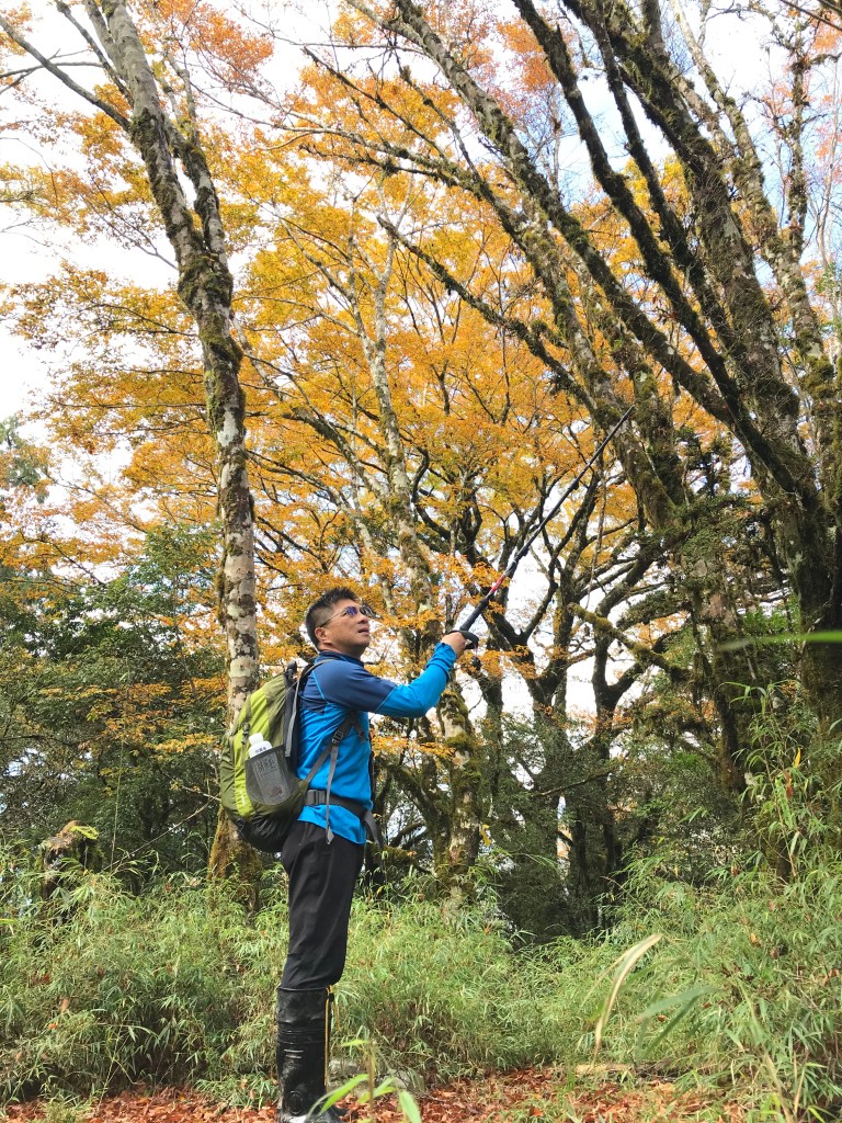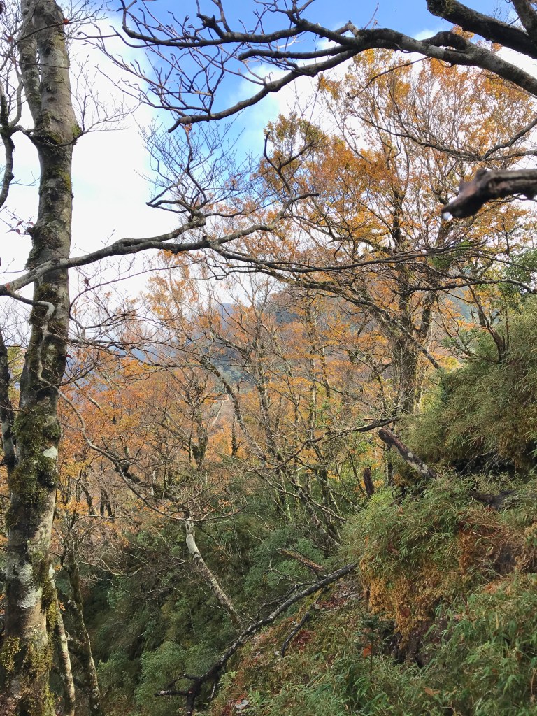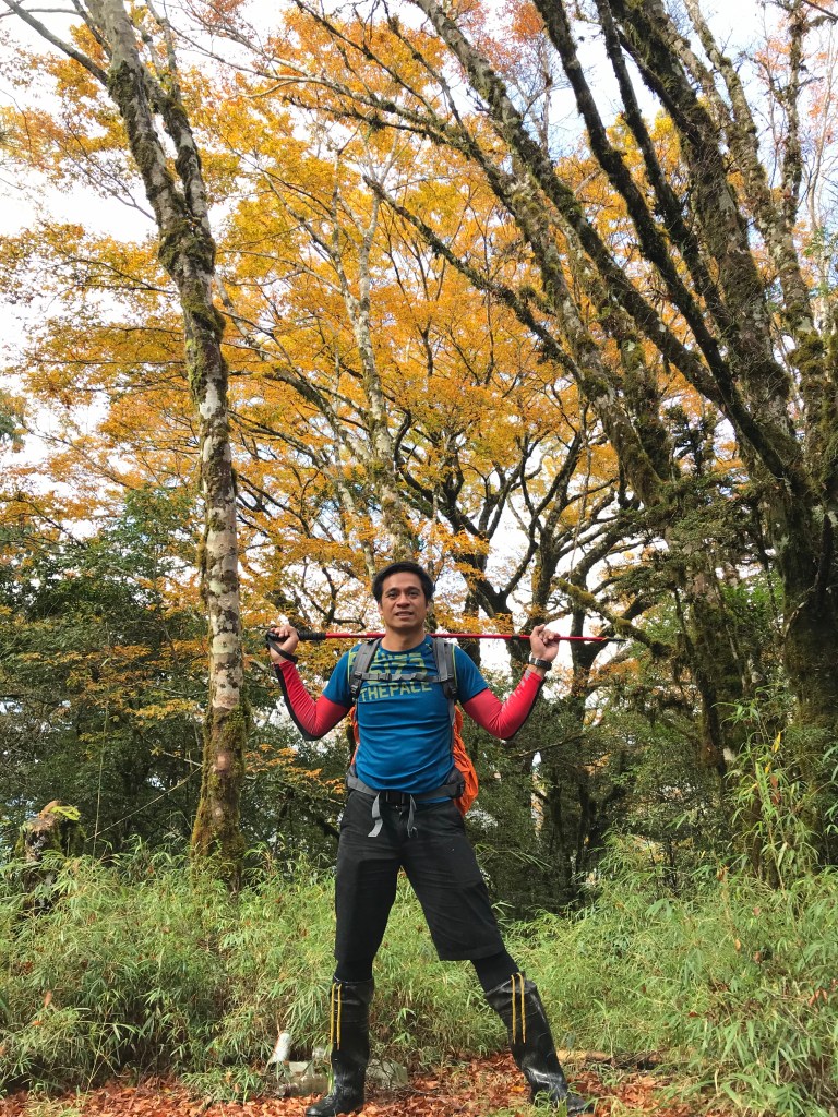 約7點回到翠峰山屋前直昇機坪停車場,Pearl已經煮好早餐等我們,吃完早餐加寒暄一下,在約8點開始由「山毛櫸國家步道」起登,此步道長3.8公里,從3.0公里到3.8公里觀景平台前,是欣賞山毛櫸樹葉轉金黃的黃金路線,也是幾乎所有到此一訪的人的終點,卻是我們爬銅山的人的起點,一路上我們三人不敢休息,說真的,連喝水的時間都省了,一直到銅山的三角點,才發現我自己喝不到200 CC的水。