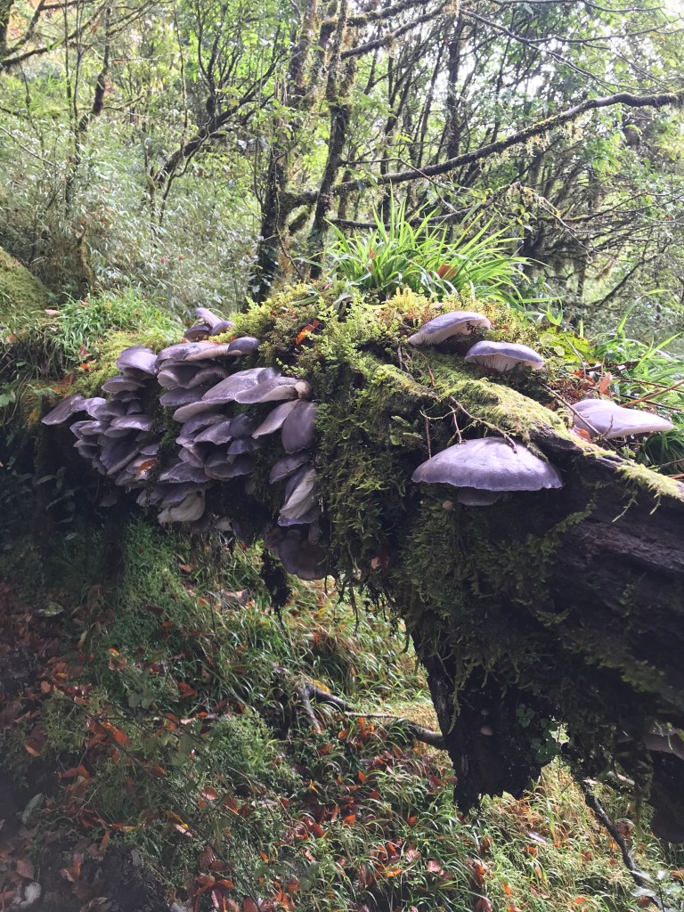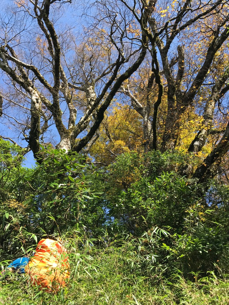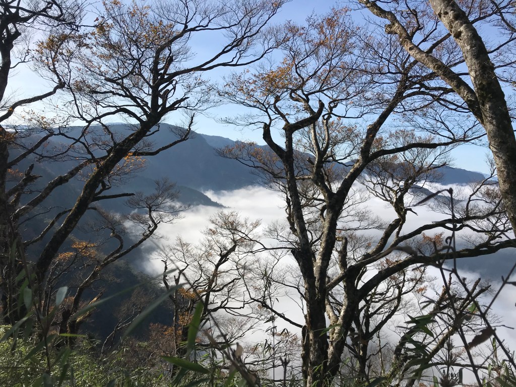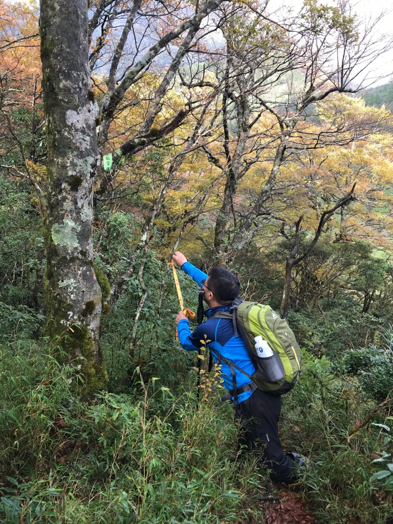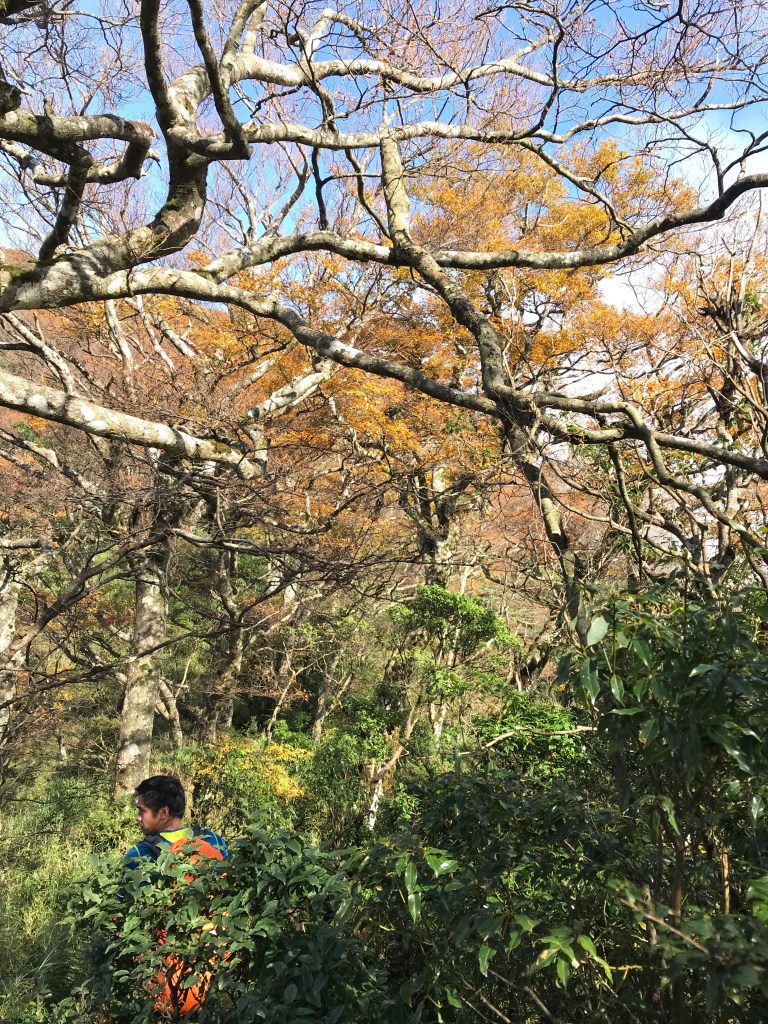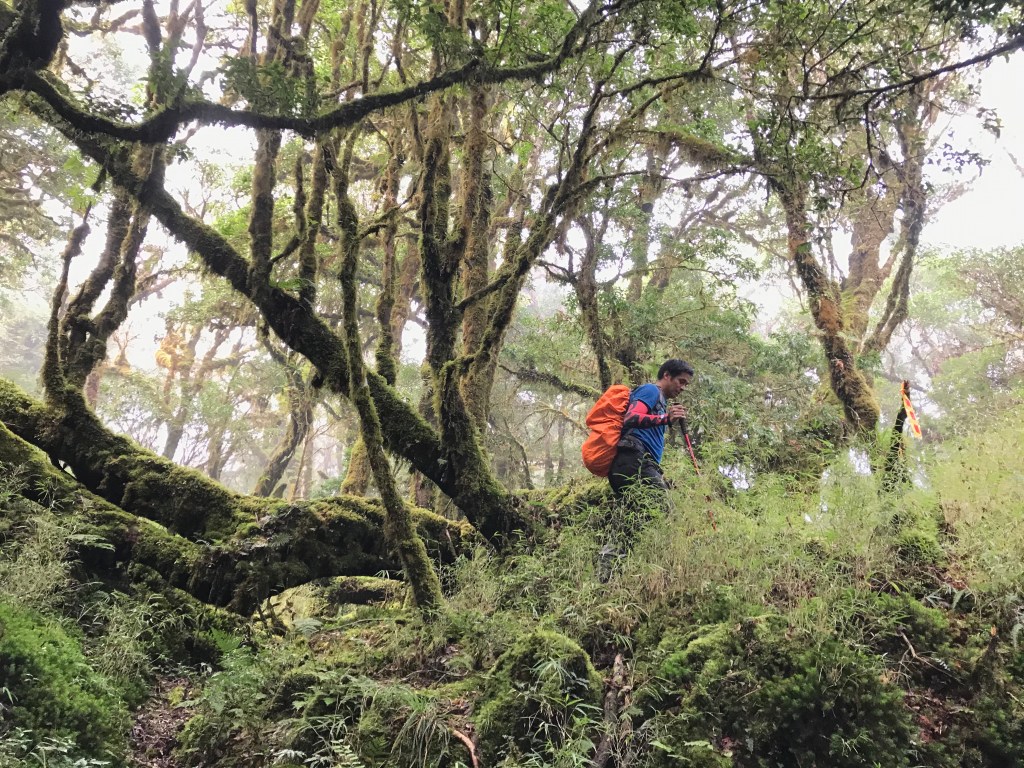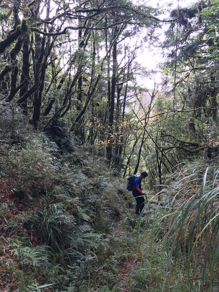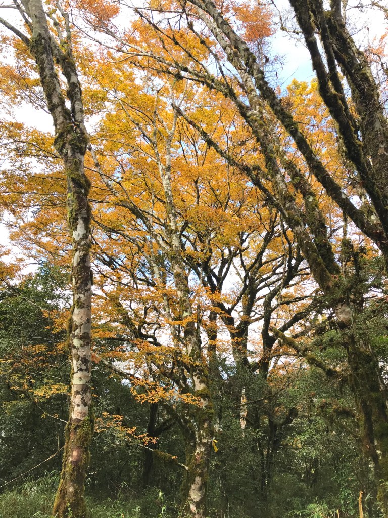 約7點回到翠峰山屋前直昇機坪停車場,Pearl已經煮好早餐等我們,吃完早餐加寒暄一下,在約8點開始由「山毛櫸國家步道」起登,此步道長3.8公里,從3.0公里到3.8公里觀景平台前,是欣賞山毛櫸樹葉轉金黃的黃金路線,也是幾乎所有到此一訪的人的終點,卻是我們爬銅山的人的起點,一路上我們三人不敢休息,說真的,連喝水的時間都省了,一直到銅山的三角點,才發現我自己喝不到200 CC的水。