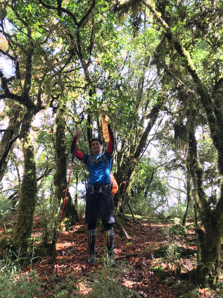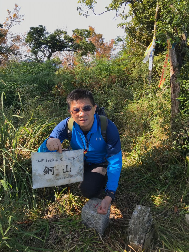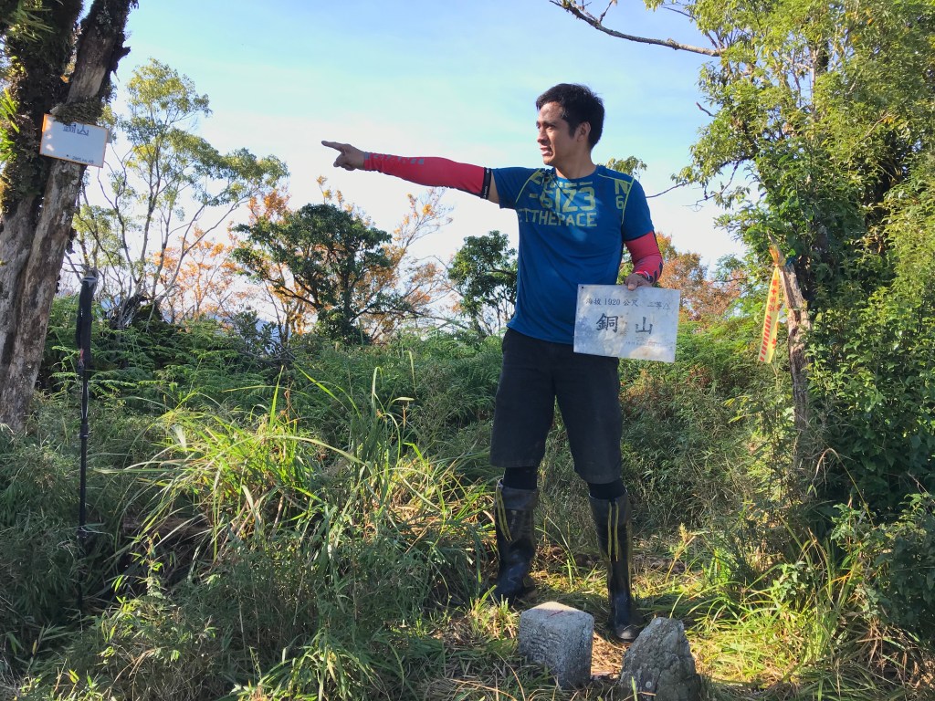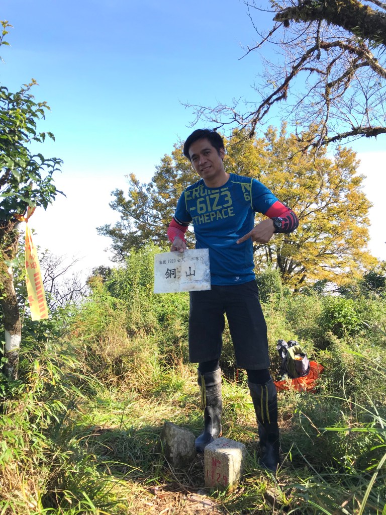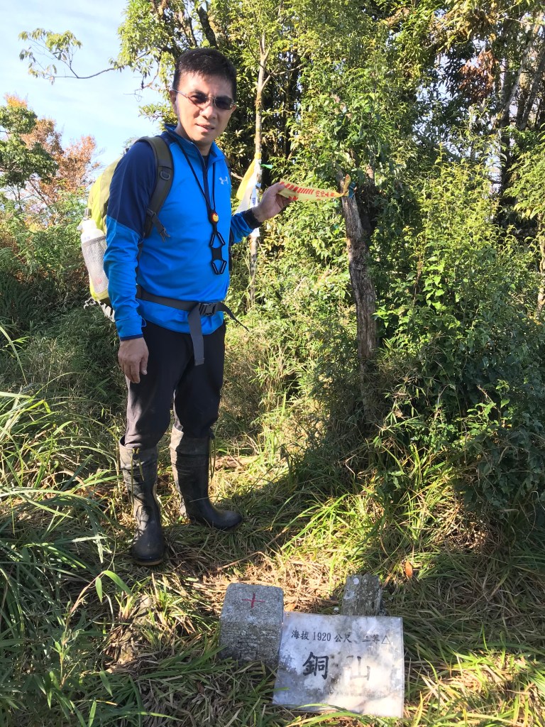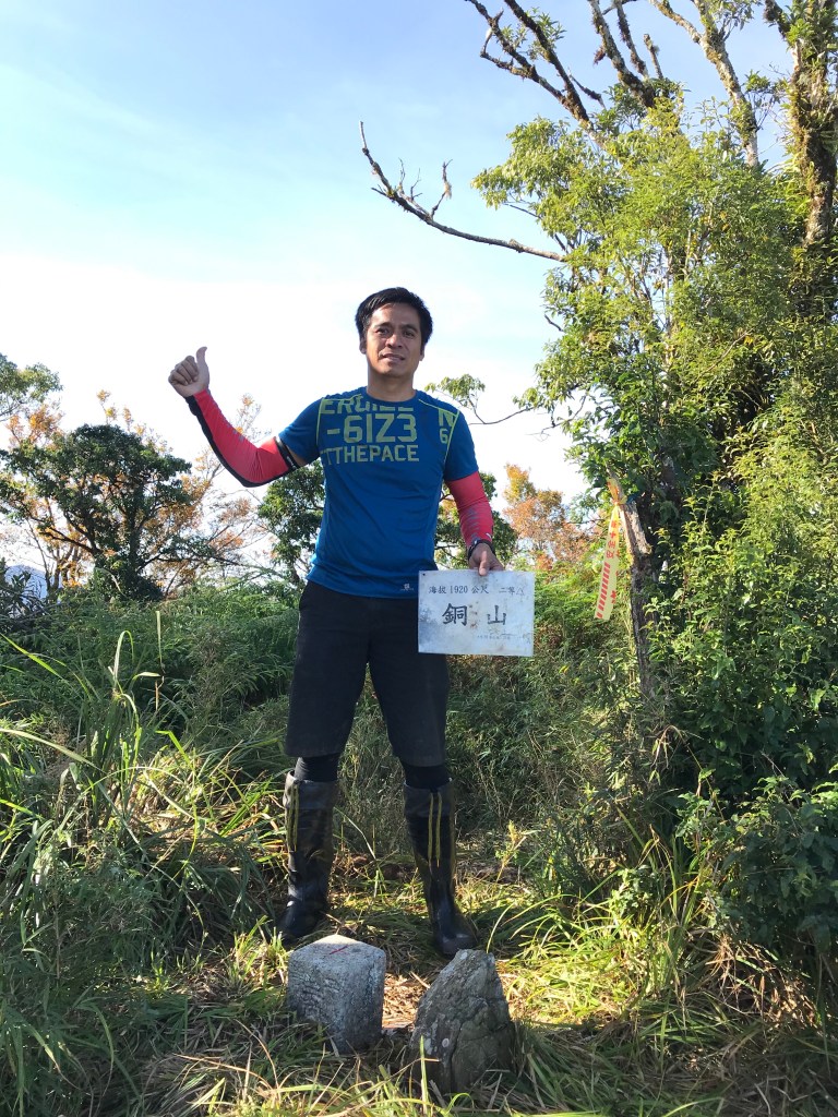 一路上要找路、防滑、拍照、攝影、做紀錄,還要綁約300條的布條。到了銅山三角點,用了6個小時多,到達時已經是下午的14:12。在此稍微休息一下,Elmer將其所帶的菲律賓國旗拿出來拍照,感受到人在他鄉依舊思鄉的情緒!休息了將近半小時,於14:43時回程下山,由於已經很晚,幾乎用盡了洪荒之力在全速下山,回到3.8km觀景平台時已經是17:42,此時天色已黑,還好回程受惠於自己綁的眾多布條,速度快了很多,回到翠峰山屋前直昇機坪停車場時為18:45。