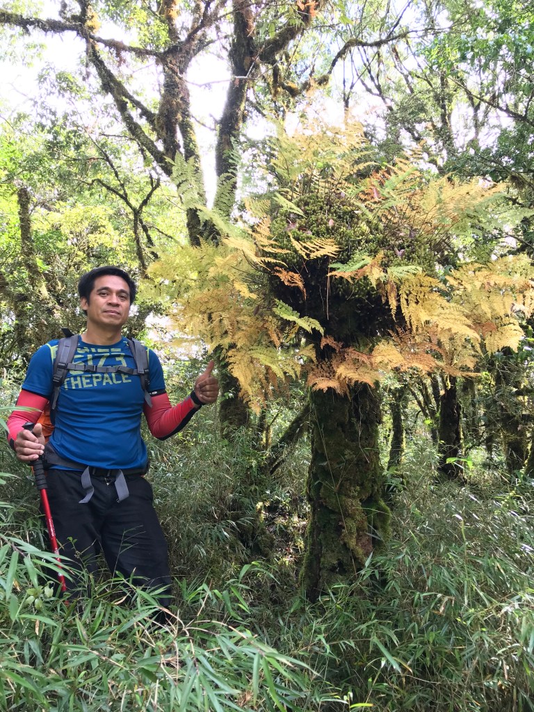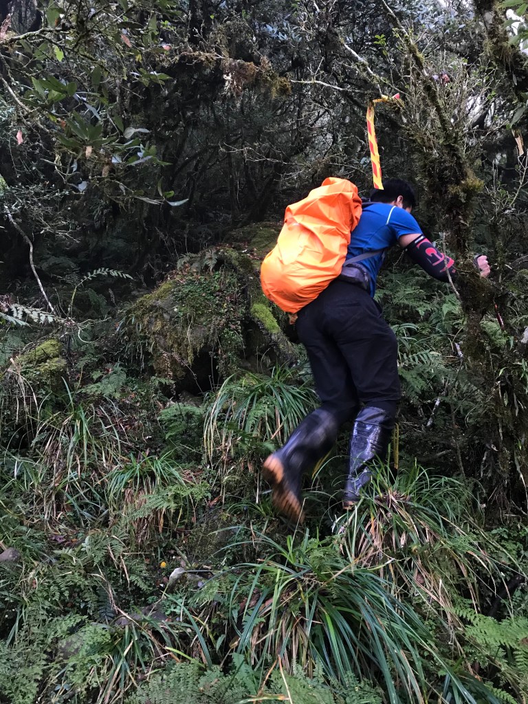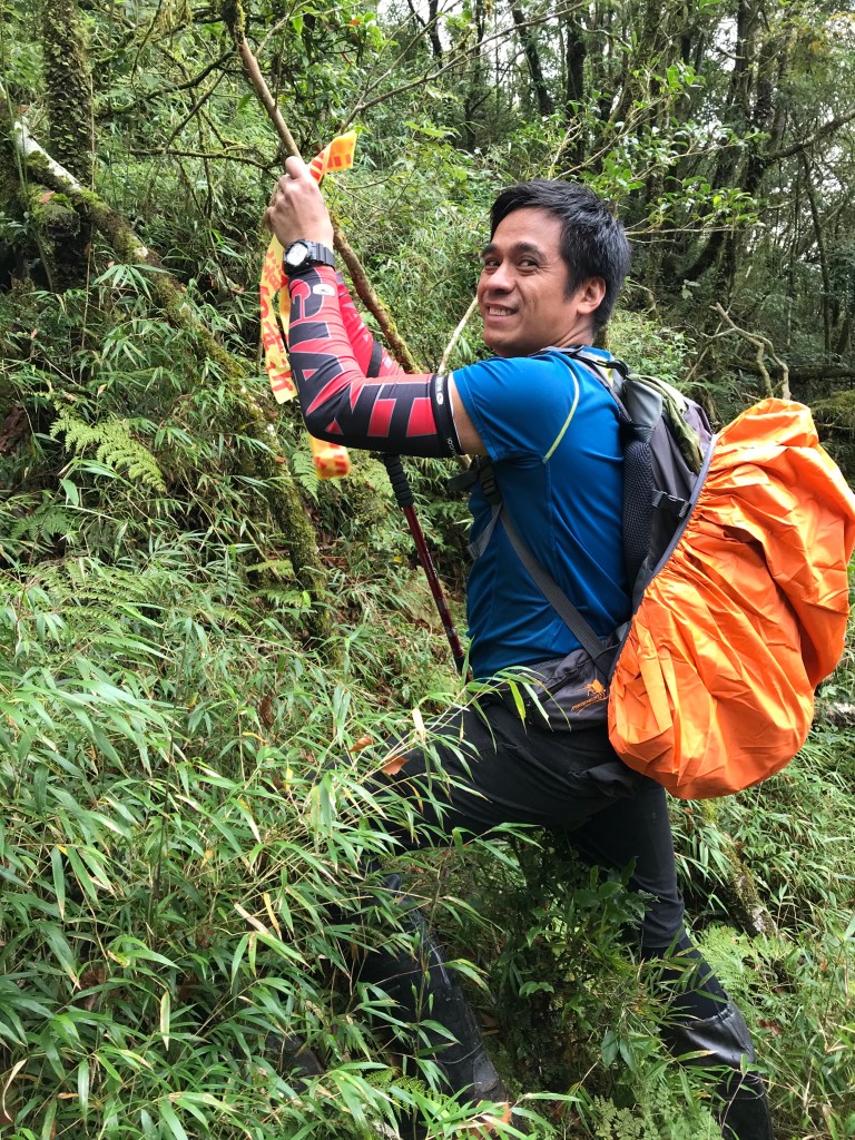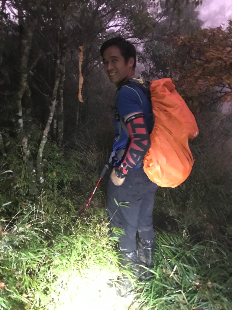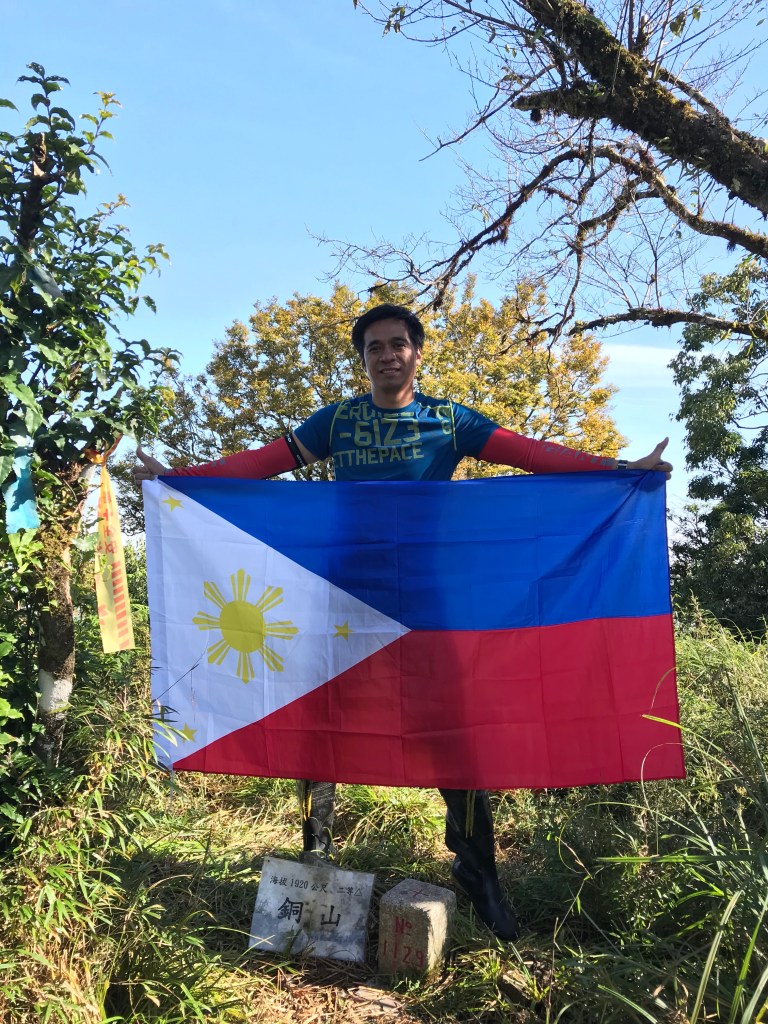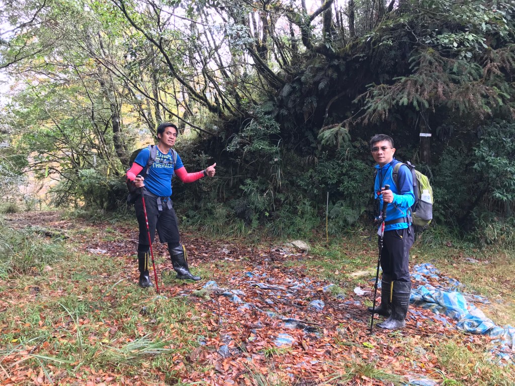 一路上要找路、防滑、拍照、攝影、做紀錄,還要綁約300條的布條。到了銅山三角點,用了6個小時多,到達時已經是下午的14:12。在此稍微休息一下,Elmer將其所帶的菲律賓國旗拿出來拍照,感受到人在他鄉依舊思鄉的情緒!休息了將近半小時,於14:43時回程下山,由於已經很晚,幾乎用盡了洪荒之力在全速下山,回到3.8km觀景平台時已經是17:42,此時天色已黑,還好回程受惠於自己綁的眾多布條,速度快了很多,回到翠峰山屋前直昇機坪停車場時為18:45。