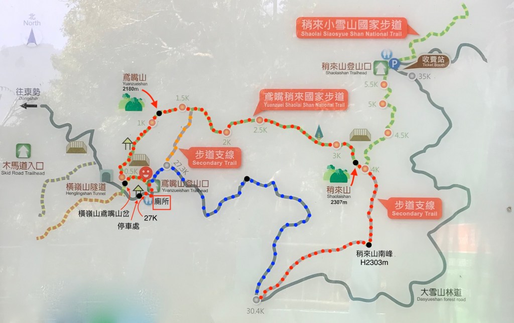 我們在12:50開車到26.9K的停車場,將車停好後,換好登山雨鞋,往前到27K+50m右側就會有廁所,如廁一下後,就往廁所對面的鳶嘴山入山口起登。