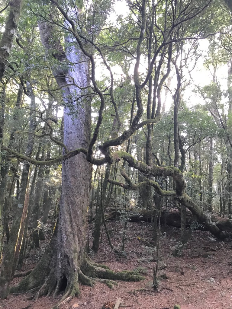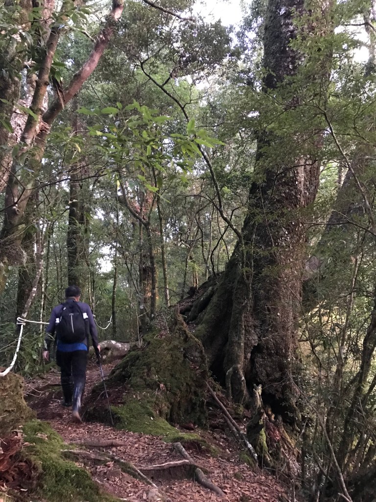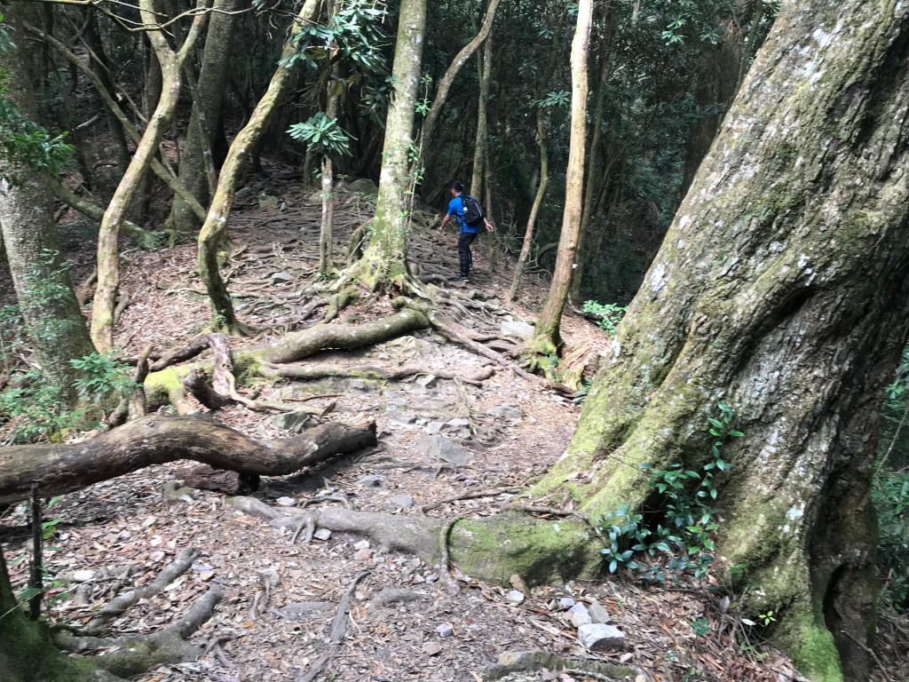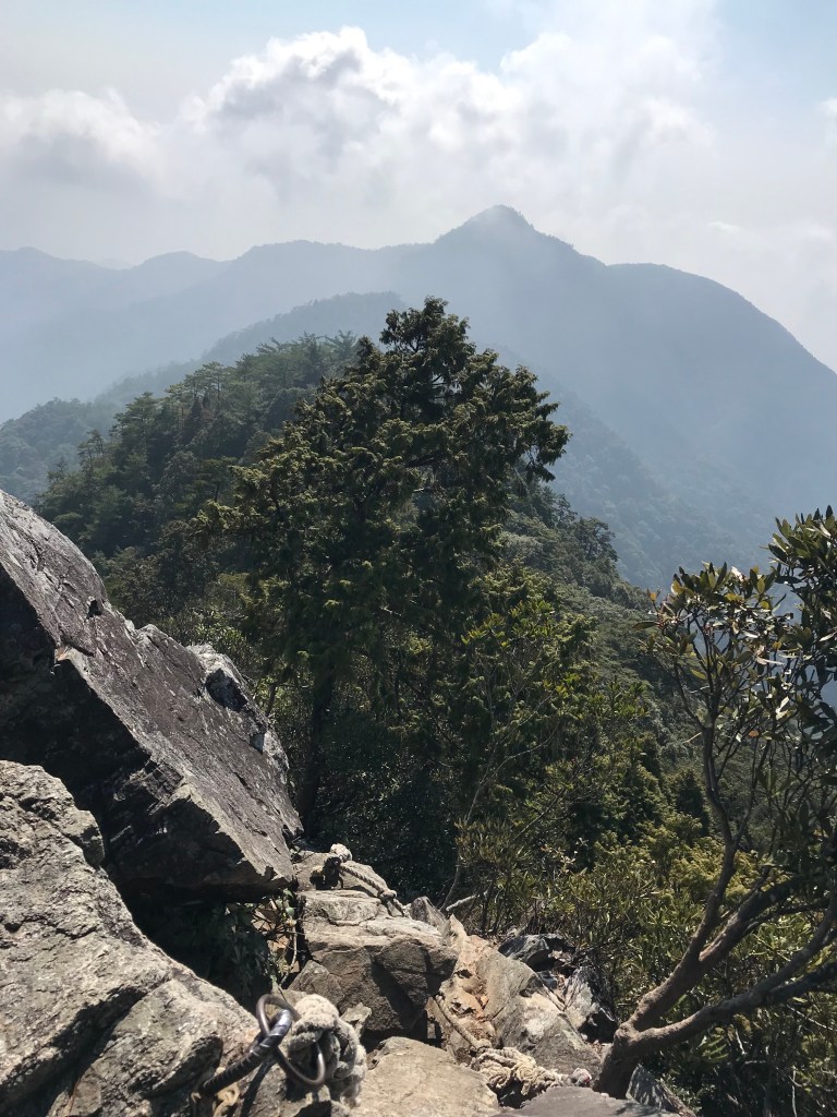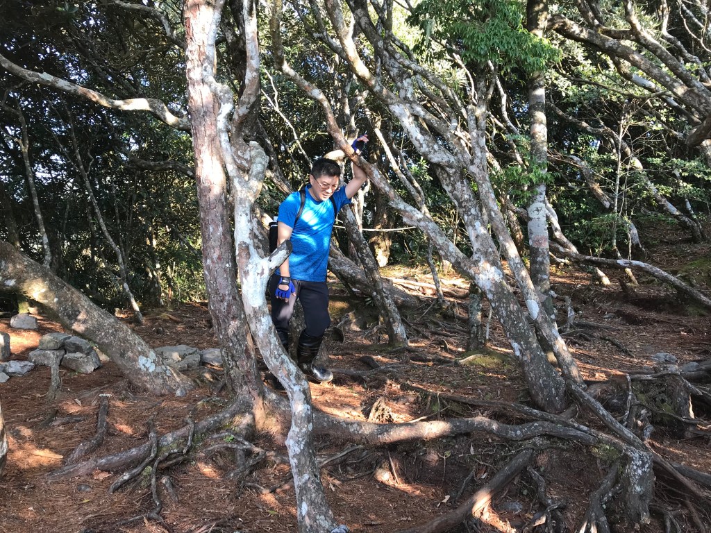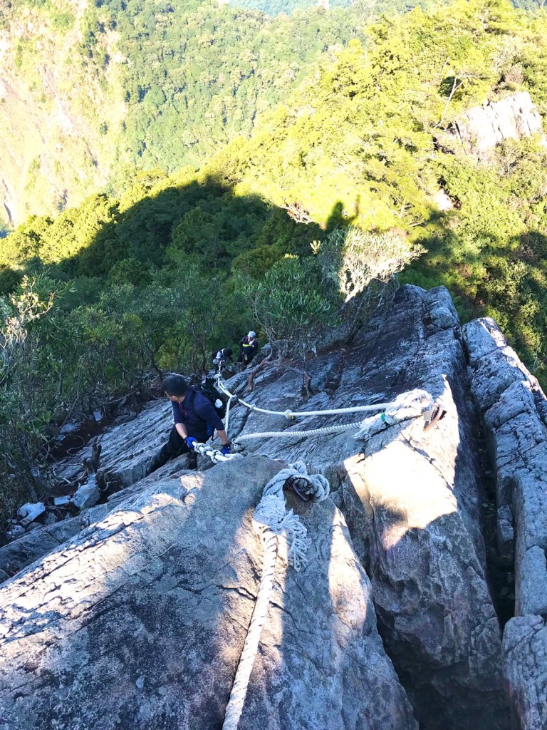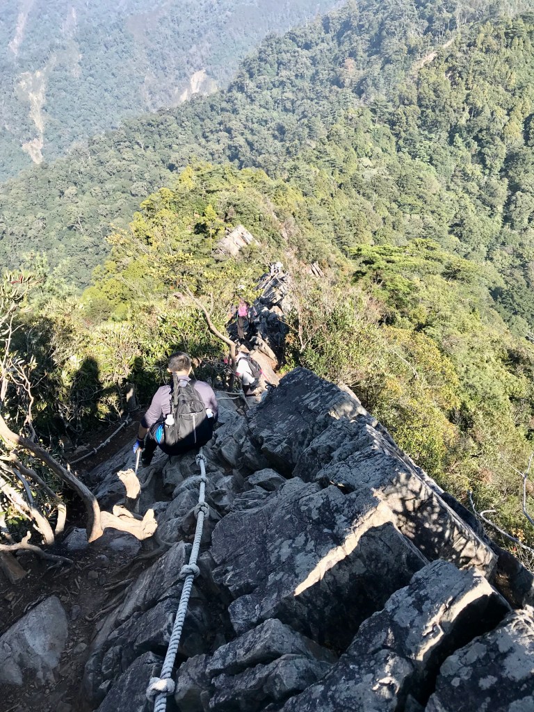 上圖:Smile正在拍攝我要下鳶嘴山的過程,而我也正在回望接下來的踏點。鳶嘴山的上山與下山過程,都充滿了像這樣略近垂直的陡峭岩壁,對於有懼高症的讀者朋友們會比較不適合。Smile在幫我拍照的同時,也將自己的影子投射在後下方的樹林中。