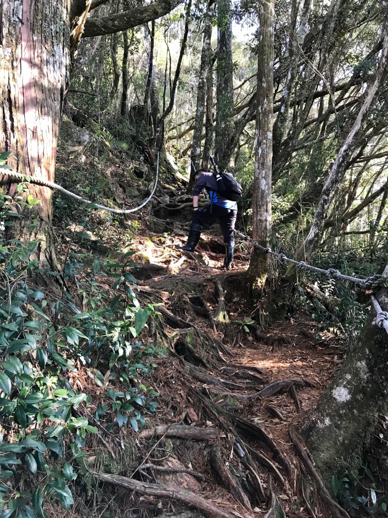 過了0.5K一直到觀景台,路徑轉為急陡上,路徑兩旁大多輔有繩索可拉,且都位於林蔭之下行走,雖然涼爽但路徑(或說是腿)很抖。