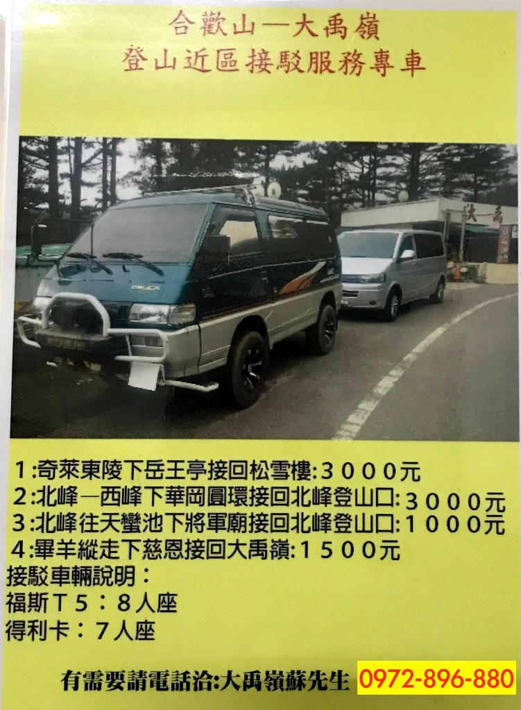 上圖:有需要的朋友們,可以聯絡蘇先生,即可安排住宿接駁加掛雪鏈等事宜。由慈恩接駁回大禹嶺的行情價為每車NT1500,最多可以坐到8人。