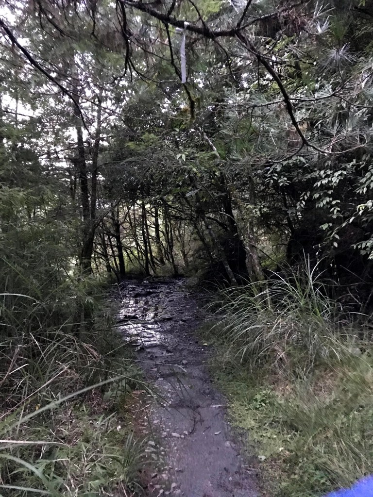 上圖:6.7K後有一段路都是泥濘路。一般的登山鞋大概不容易閃過,Smile要求我今天一定要穿登山雨鞋。泥濘的狀況,像這樣的路段有好幾處,在起登摸黑階段,大概就只有登山雨鞋比較容易順利通過。05:39