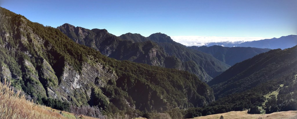 上圖:邊陡上邊回拍。由左側往右側來看,應該是中央尖山、甘薯峰、無明山、鈴鳴山、鋸齒連峰與畢祿山,更右側後方我猜應該是奇萊北峰及主峰吧?