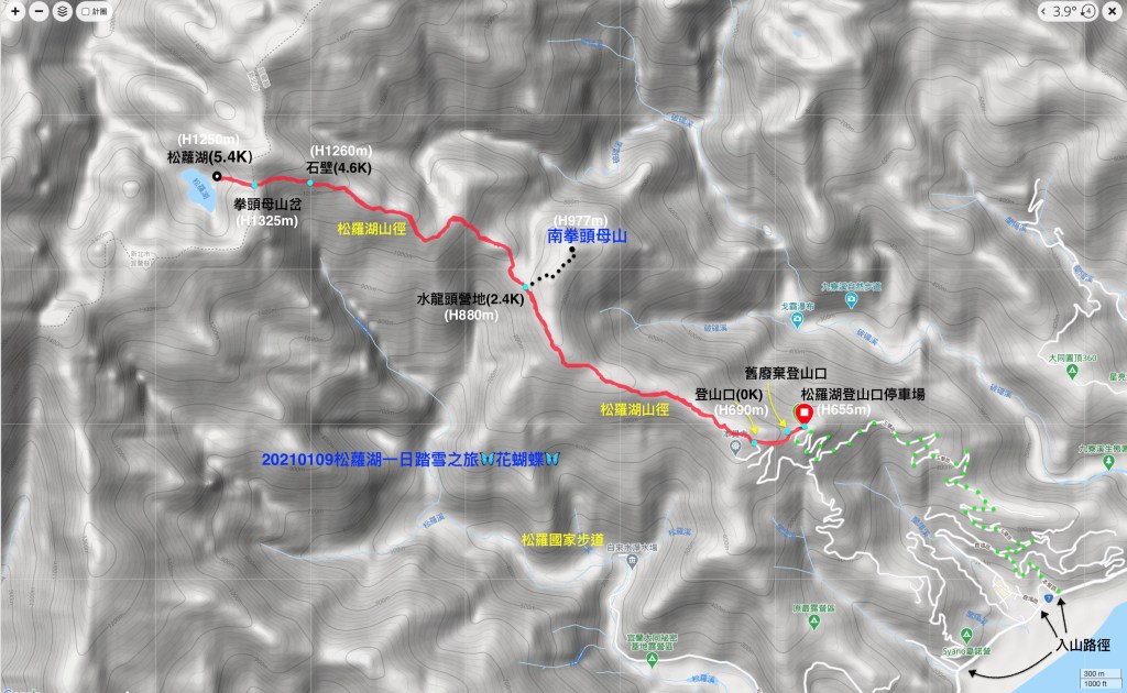 上圖的時間海拔高度圖,顯示出從停車場開始就是一路往上,一直到水龍頭營地止的這一段路是緩上且好走的路徑,過了水龍頭營地後的路徑,就是黃土加上樹根路,隨著海拔越來越高路徑上會在加上有越多的石頭,約在山徑4.5K後就是大石頭的路徑,在山徑的4.6K到達石壁區,過了石壁區後再往上一段就會到達拳頭母岔,此為今天路程的最高點,此處已經是銀白世界!再往下切約走350m即可達到松蘿湖,今天是滿水位,因為下雪湖邊皆為爛泥,不利行走容易滑倒要非常小心。