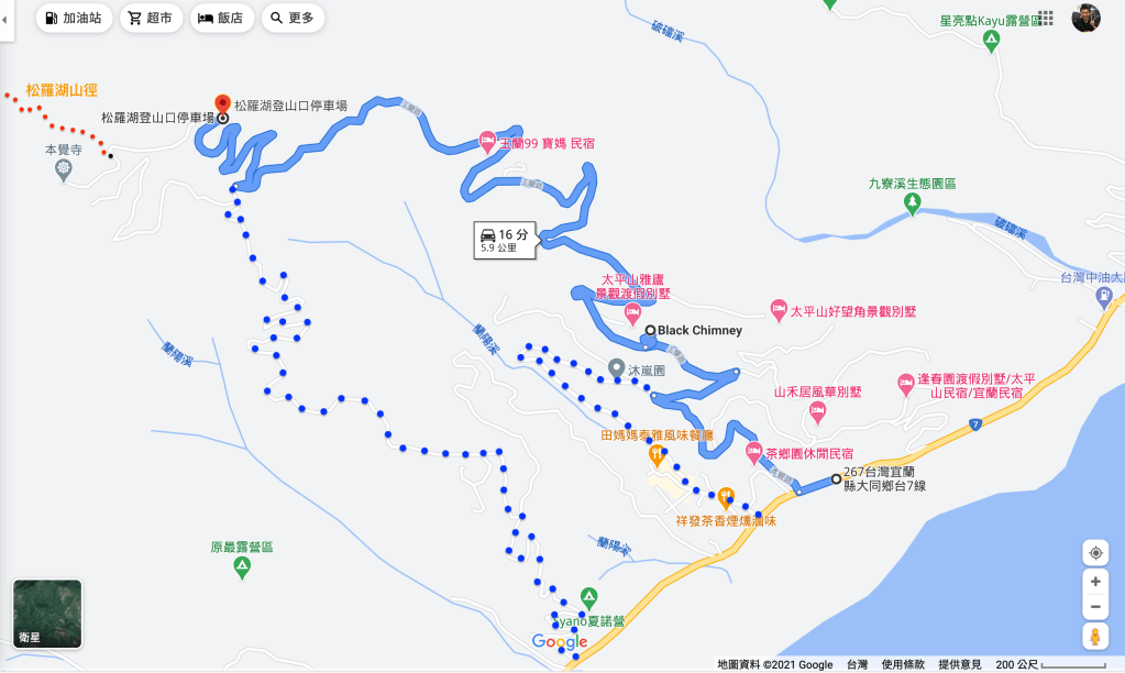 當日我們五人相約6點半於「宜蘭縣政府警察局三星分局大同分駐所」集合辦理入山證,再驅車前往玉蘭部落進入松羅湖登山停車場。如下圖所示:
